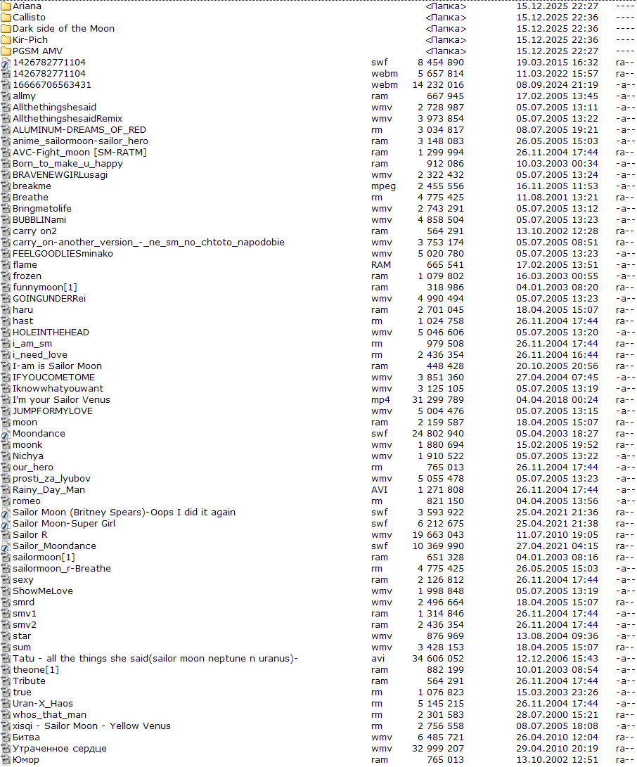 Что я знаю: Исполнитель оригинальной песни: Dune Название оригинальной песни: Dark side of the Moon Формат файла: .mpg Название файла: SailorMoon_-_Darkside_of_Moon.mpg или Sailormoon.mpeg Где я его брал в 2005-м: sm-forever.narod.ru (осторожно, на этот сайт ругался антивирус, но сейчас он не существует, однако сохранилась копия на Web Archive), там он был в многотомном архиве Название архива с файлом: архив был разделён на две части, Darkside_of_Moon.part1.rar и Darkside_of_Moon.part2.rar На WebArchive смотрел. Я нашёл вторую часть архива, но первая не была спаршена, её там нет. Поиски завели меня сюда: https://www.animemusicvideos.org/members/members_videoinfo.php?v=1318 Судя по всему, оригинал лежал тут: http://s95100705.onlinehome.us/mv/Sailormoon.mpeg , но сейчас его там нет. На ВебАрхив смотрел, но, всё, что я там нашёл по s95100705.onlinehome.us - эту глупую птицу (пикрелейтед). Внимание, вопрос: где ещё можно найти оригинал этой AMV в MPEG без конвертации? Мне она дорога как память. Это была одна из первых, если не первая, AMV в моей жизни. Может, есть ещё какие-то сайты-сборники AMV?