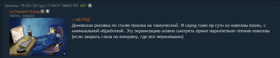 И дальше по списку: Melty Blood - серия файтингов и продолжение несуществующего рута Tsukihime. С чего начать - один из платиновых вопросов этих тредов. Срсли, в шапку не влезет. Kara no Kyoukai - цикл ранобе и полнометражных аниме-экранизаций. Конечно же "книга лучше", но аниме 11/10 - тягучий фентези-триллер, Финчер бы обкончался. Я специально поставил его в конец. Хочешь вкатиться с полного нуля - вкатывайся с этого. Включи себе поздним вечером в ненастную погоду, когда тебя никто не потревожит, приготовь себе батарею чая и бутербродов, тебе понравится.