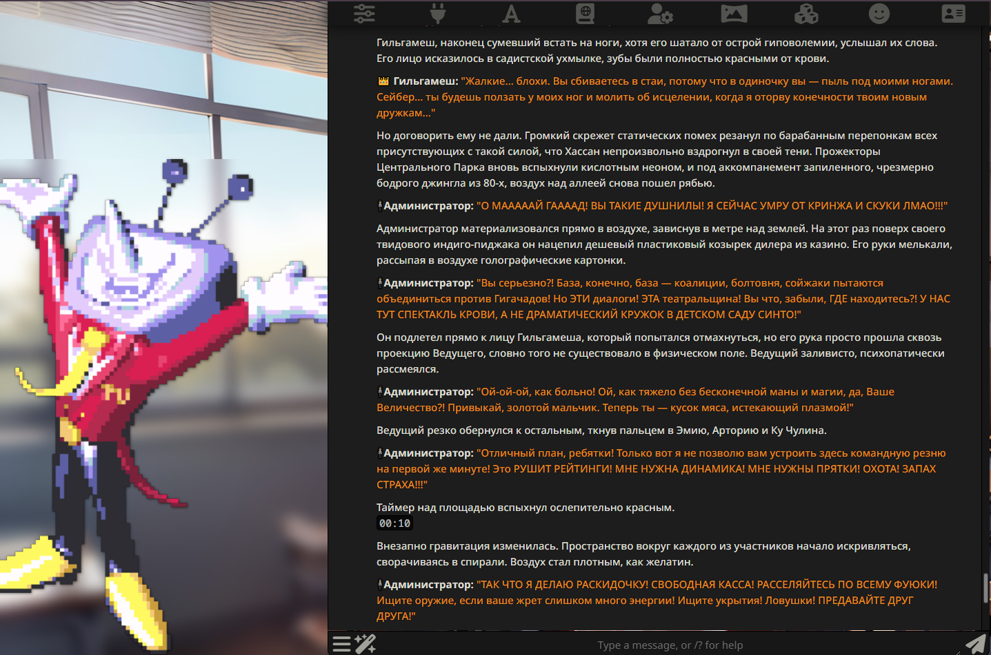 Я окончательно ебанулся и сделал возможным проведение Королевской Битвы (в рамках сюжета нейролоботомита) с упором на персонажей Насуверса. Чтобы не спамить плохочитаемыми картинками нормально оформил всё в рентри - https://rentry.co/43wfc2ox. Администратор - это ведущий игры. Анон - это (смоделированное) коллективное бессознательное треда. В этом охуительнейшем приключении вас ждёт: суровая физиология, кальцифицирование век, микроинсульты, каннибализм и полное отсутствие внешней праны. Это как F/GO, если бы его писал больной ублюдок. Нобуфаг, ради бога, откомментируй плз. Ты же тоже видел АИ-битв тред в /b/, я бы хотел видеть объективное сравнение.