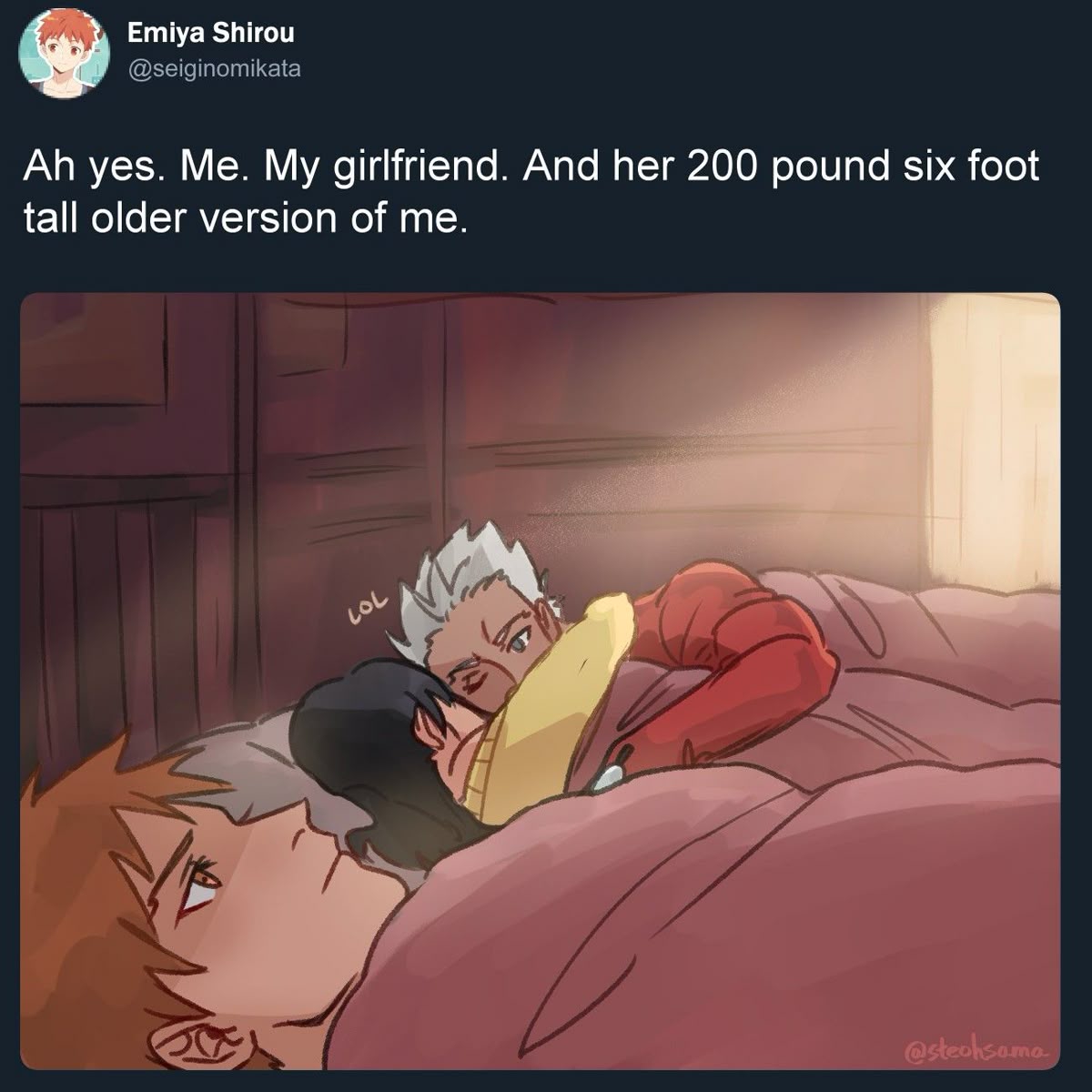 Даже интересно что за везунчик тот человек который свою тяночку слугу манатранферит , он осознает как ему повезло в этой жизни? У него в постели боевой потенциал сравнимый с целым государством и так еще тяночка красавица . Хотя этот случай конкретно если тебе выпал женский героический дух . Хотя если в общем думаю жили бы и не отсвечивали никак (может быть какой нибудь Эмия бы рано или поздно из-за низкой удачи попал бы в жопу и пришлось бы ему начать карать несправедливость и беззащитные анусы) Хотя страшно представить , если ты мастер в войне святого грааля ирл . Выиграл войну , у тебя слуга Мордред сейбер. Загадал что бы она с тобой осталась , думаешь все любовь морковь . Но тут объявляются местные аналоги SCP (их штурм отряд) тебя и твою вайфу ведут на допрос и выбор , либо работаешь на них , либо в землю . Даже если так задуматься , то в реальности в которой эта Война прошла , существует магия в каком либо виде , значит должны быть организации которые с ней связаны, особенно организации правительства или над правительства которые занимаются так же включительно отловом всяких аномалий и экстрасенсов для своих нужд.