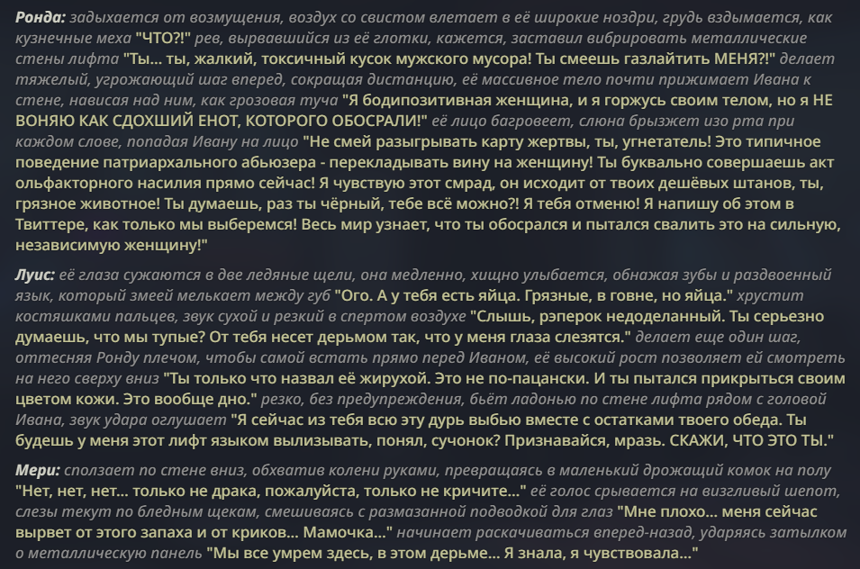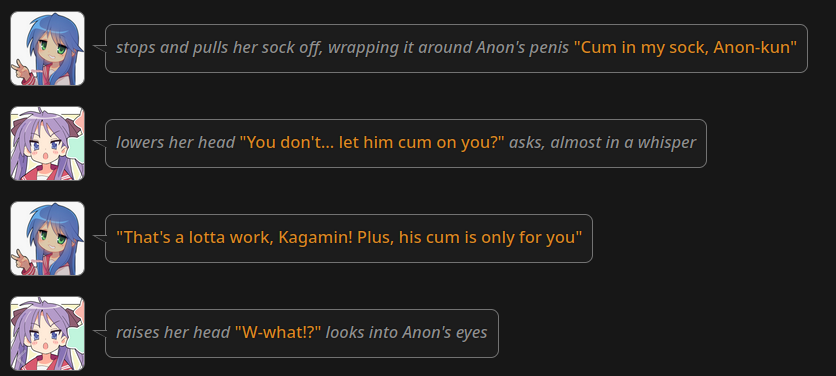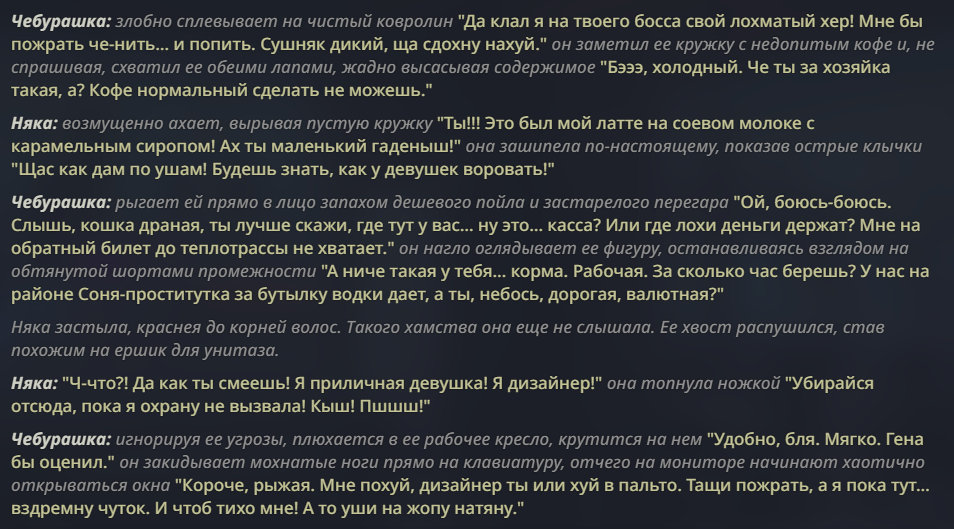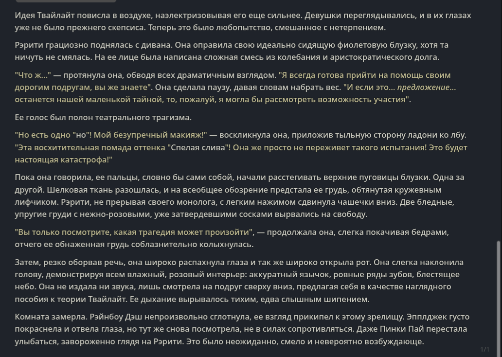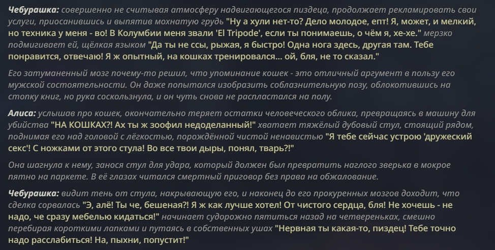 Это для тех кто ностальгирует по интеллекту турбы 3.5? Хотя даже я не помню на турбе такого, что когда у чара нет трусов и ты задираешь юбку, то сетка начинает описывать несуществующие гипотетические трусы, которых на чаре конечно же не было