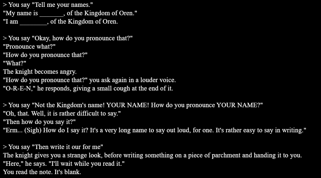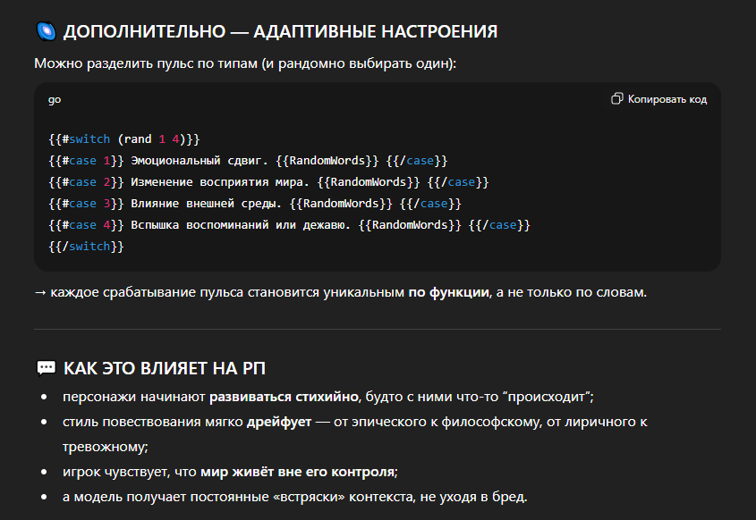 >>1414113 >за счет исключительно гритинга и сценария, ни разу такого не видел Мало кто разделяет описание чара и сценарий даже в пресетах, не то что в картах, но я привык так. Да и философски это правильно, сценарии в одну кучу, персонажи в другую, но поскольку мы все сидим в таверне дураков, где эти понятия сложно пересекаются, имеем что имеем. А так можно просто использовать описание других персонажей и вводить их в сценарий через гритинг, условную Марию как барменшу или вайфу в качестве гостя. Надо будет переделать гритинг за гостя на более нейтральный, чтобы можно было заходить внутрь вместе с вайфой и отыгрывать с ней, посмотреть кто за кого готов пулю словить...