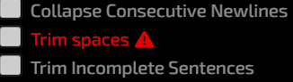 >>1414362 А нахуя? Хотя вот ты сказал, я залез и у меня там вот такая красная надпись, написано что отключать это не рекомендуется, а у меня было отключено. Кто знает что это за хуйня trim spaces? В доках таверны про это нихуя нет. Пусть и дальше будет выключено или включить?