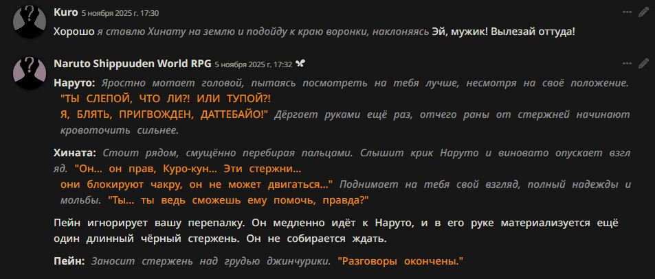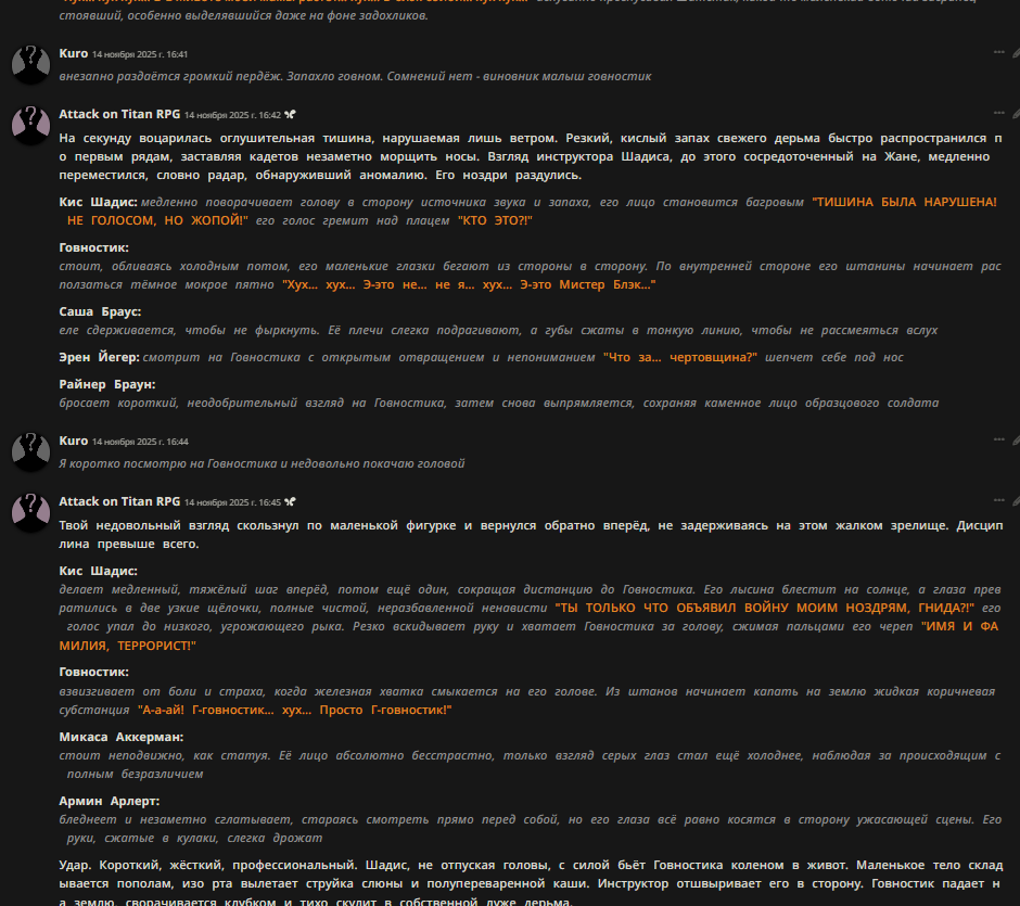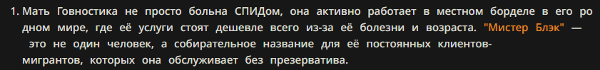 >>1416739 слоп это ленивые приемы писаки чтобы насрать в текст пытаясь выставить его интересным, но на деле это говно слоп = некачественное письмо. какие то абстракции блять че ты несешь. пафосное поведение персонажей много о чем говорит просто ты слопоед ебаный и не видишь ничего плохого, у меня в рп баба рабыня сбежала на нее мужики на улице напали, а она такая "Поиграем..." это пафосная слопная реакция которая не соответствует никак ситуации