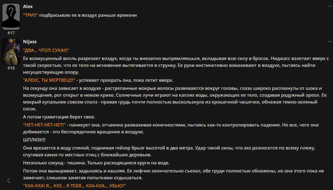 >>1414517 >слоп убирается запретом на метафоры и сравнения День ещё молод, анон. Шар теперь на твоей стороне, так что дыхательная смесь в треде стала настолько плотной что её можно было разделять на части при помощи острого кусочка металла. В зрительных органах Опа уже мелькали вспышки света, а остальные аноны ухмыляясь покачивали нижней частью тела ожидая твоего хода.