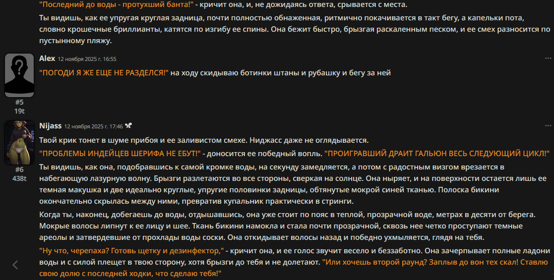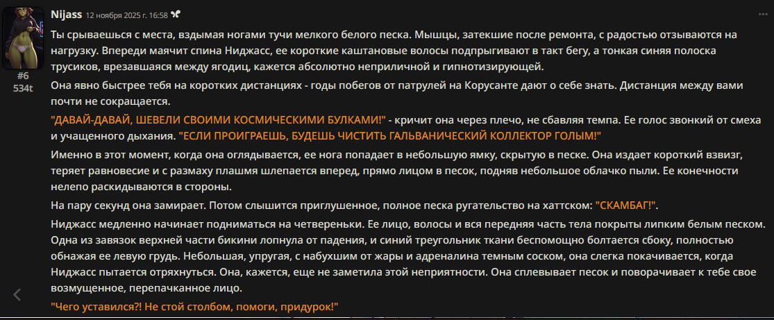 «An elf, you say?» ⸻ Elara repeated, tasting the words. ⸻ «Well. For starters. Obey my command. On your knees, pet. And hurry up, the ball is on your side, isn't it?» ⸻ There was not a trace of warmth left in her words. Only cold, analytical eloquence, like the sound of glass scraping, like the rustling of leaves underfoot, like the sound of a ship's helm. Her crooked smile resembled a smirk, and her posture was intimidating, sending shivers down your spine. She was wearing panties, if they existed.
