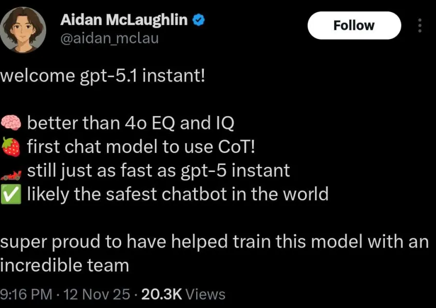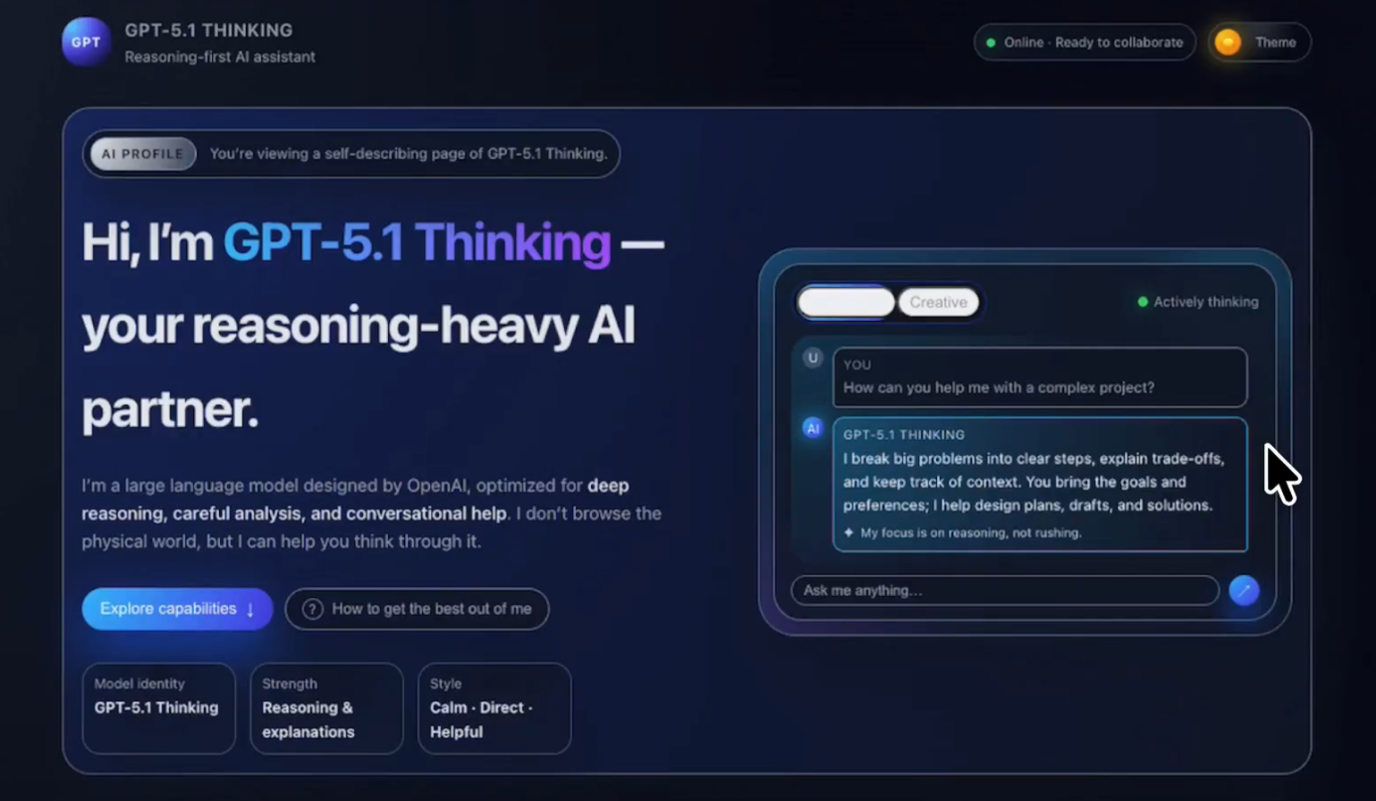 GPT-5.1 представлена в двух вариантах: GPT-5.1 Instant и GPT-5.1 Thinking. Согласно официальному релизу, первая «теплее, умнее и лучше выполняет инструкции пользователя», при этом скорость ответа у неё выше.