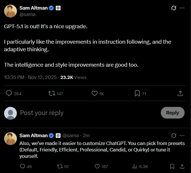 OpenAI также объявила о расширении предустановок «личности» GPT-5.1. Согласно сообщению в блоге компании, теперь список доступных вариантов включает «По умолчанию», «Профессиональный», «Дружелюбный», «Откровенный», «Причудливый», «Эффективный», «Занудный» и «Циничный».