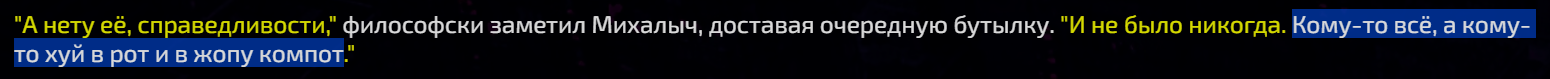 >>1414091 Писал в том тредике отзыв, но ушел на пары, пришел и лег спать. Сделано интересно за счет исключительно гритинга и сценария, ни разу такого не видел, ну, я редко новые карточки смотрю. Поиграл, в целом все хорошо, говорил с Колчаком, как в сирике, и с другими личностями. Но, раз уж ты >начал серик смотреть. Досмотрю и доделаю там пару нюансов то думаю, что станет еще лучше. Спасибо, добрый анон, что отозвался на реквест. >>1413936 Вот бы кто-нибудь все-таки по Сопрано сделал...