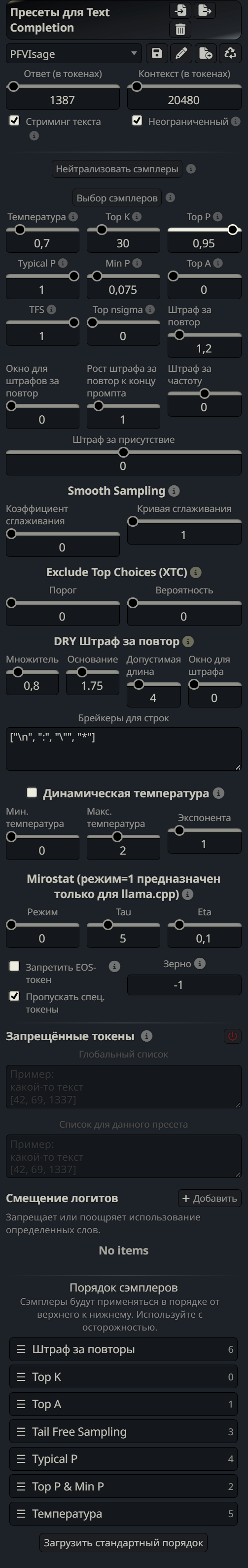 Бля как-то давно спизданул те что нейтрализовать семплеры это их нахуй убрать, но там есть отдельная кнопка в таверне сделай как этот дядя >>1418419 и аж только потом крути мин п и повторы по мере шизы модели