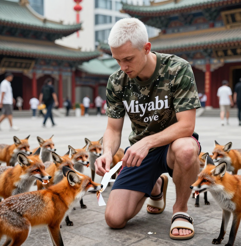 > Короткостриженый с недельной небритостью белый мужчина плохой внешностью 30 лет одет в спортивные шорты, сандали с носками и футболку с милитари-расцветкой в пиксель. На футболке мужчины надпись "Miyabi love" Находится в китайском современном городе с китайскими достопримеательностями. foxes gathered around the man foxes are eating film tape man on one knee is feeding film tape to foxes Что я могу сказать? Z модель цензурирует носки с сандалями!