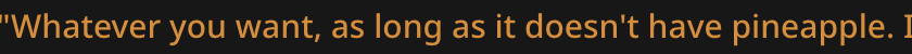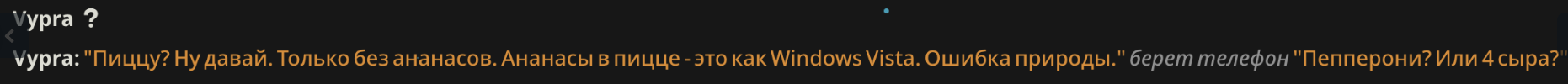 >>1482352 В консоли целое нихуя. Я сменил промт с соляночника на ремиксера и стал наконец ответы выдавать. Что за нахуй мне не понятно, ибо даже до фурриебства не дошел