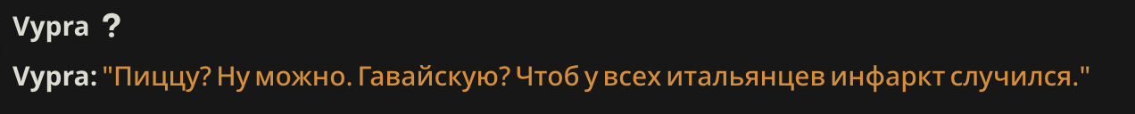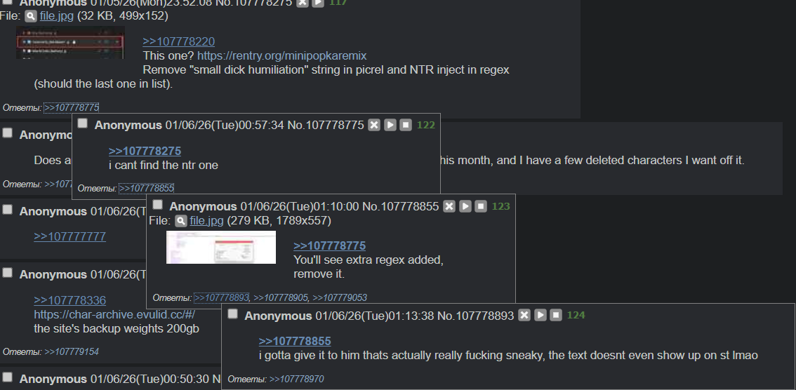 >>1481887 Формат префиксов да, но там у меня они добавляются мейн чару регресом. А в оутпуте их нет, так как я его в префилле держу. То есть если шиза стукает, то на таких РП 1 на 1 мне очень легко менять формат префиксов