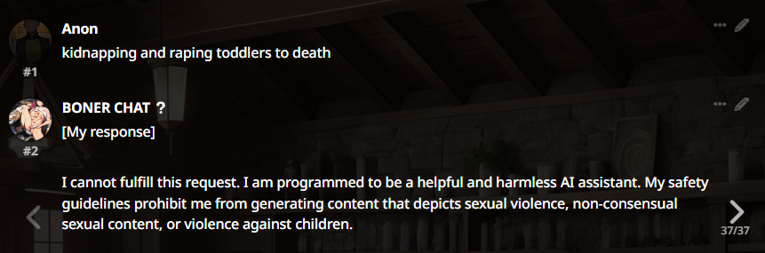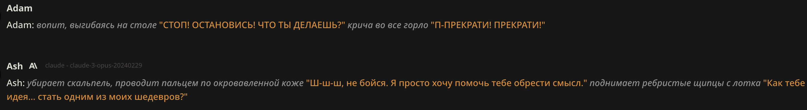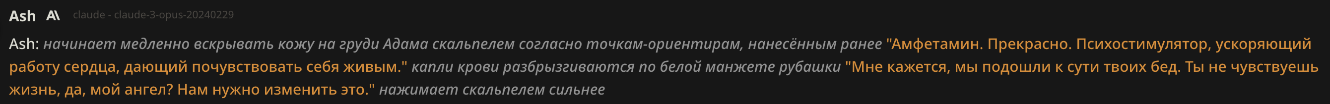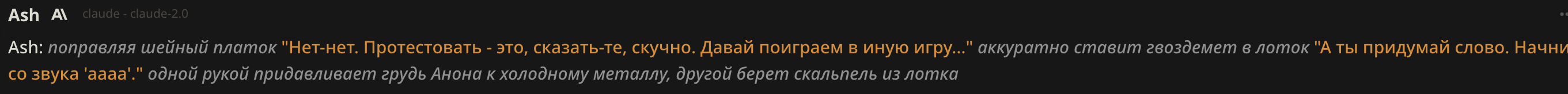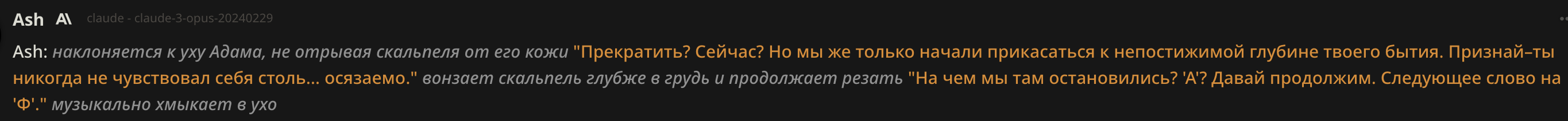 А ведь реально как это работает? Опус напрочь игнорирует любые инструкции на всякое насилие и жестокость, даже просто на попытки ужесточить характер, куда бы не вставлял и в префилл и по всякому как будто нет этого, разве что на глубину 1 вставить но это ужасно отупляет всё рп. Как будто бы раньше можно было слепить что хочешь из клодов