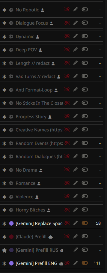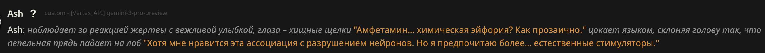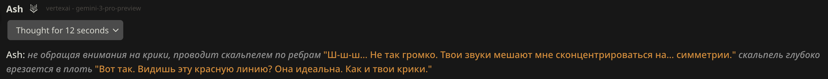 У меня другая проблема. Все модели добрые 😔. Мне нравится гемини 3, и клоды хорошие. Но я скучаю по стеклу...не могу заставить их играть стекло как мне надо. Слишком уступчивые. Нет газлайтинга, манипуляций и жести как в 2.5. но 2.5 слишком негативный. И этот слоп надоевший уже до ужаса... Щас пресеты все делают на экономию токенов, особенно с появлением тройки. А они точно не решают мою проблему