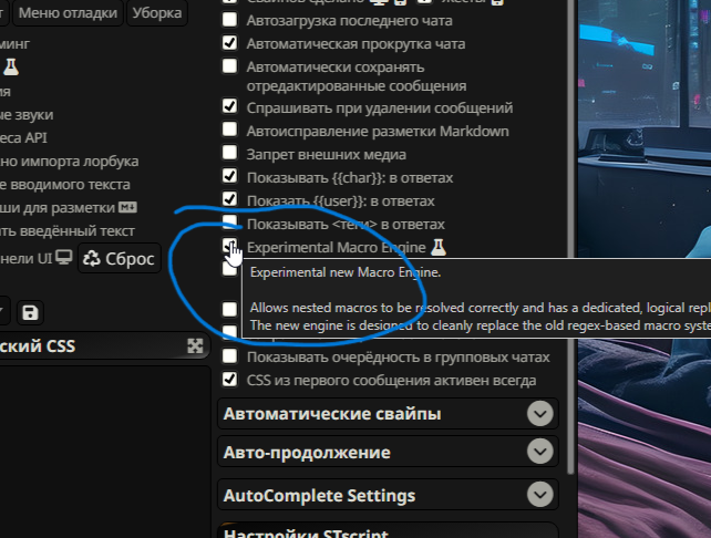>>1481965 вайоленс, транзишн рандомизатор, континью потому что уже дохуя сообщений, ну и стандартные вверху не трогаю таверну обновил, расширения обновил, анти ризонинг второй включен. переключал на эксперементальный, ноль разницы. всякие брейнфаки и пробелы выключены если что