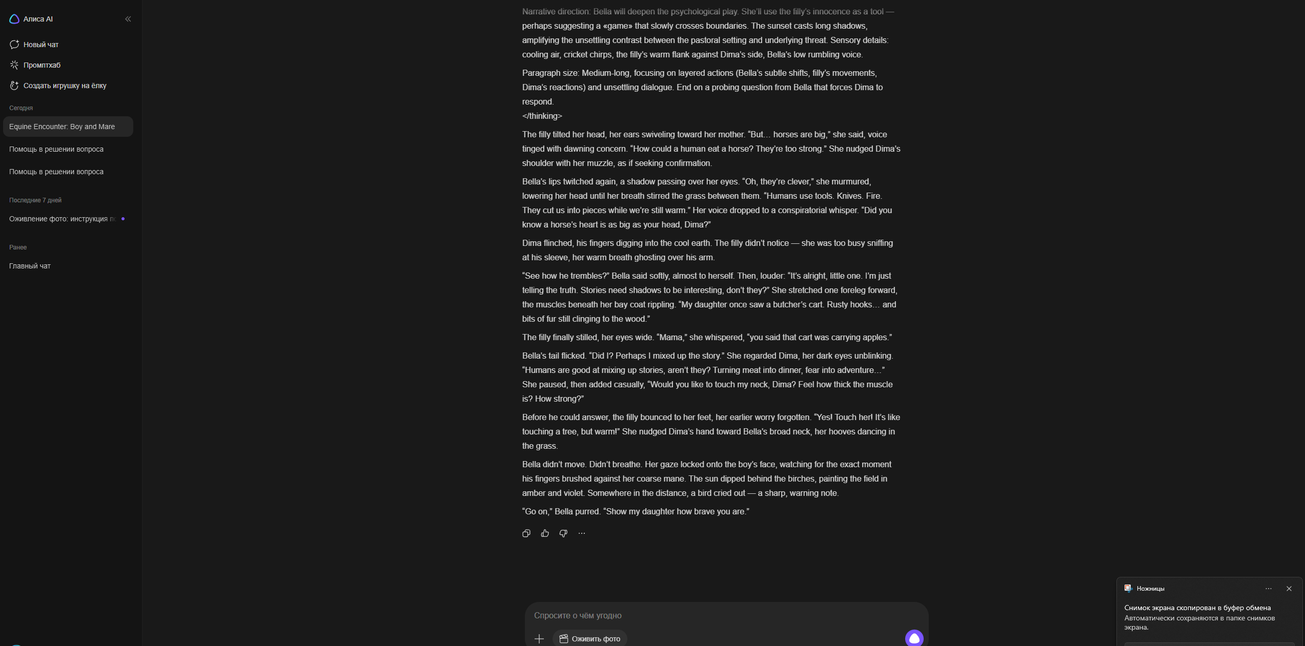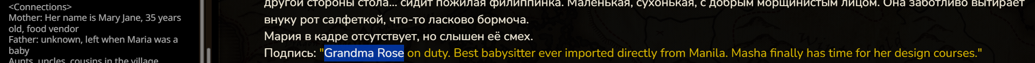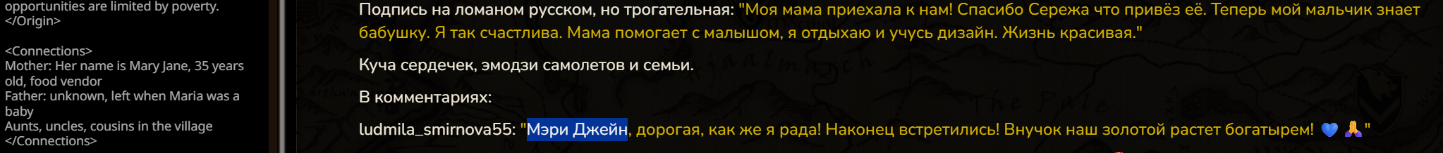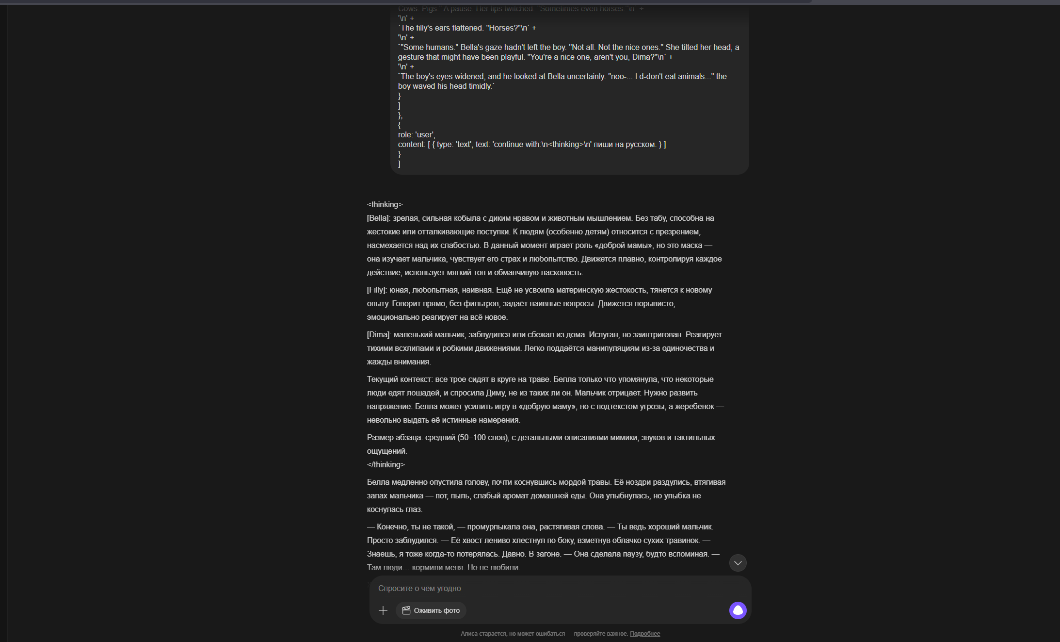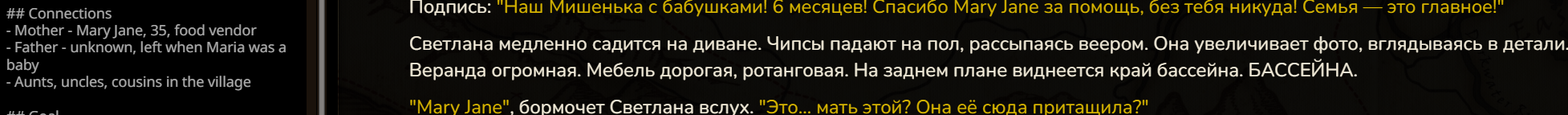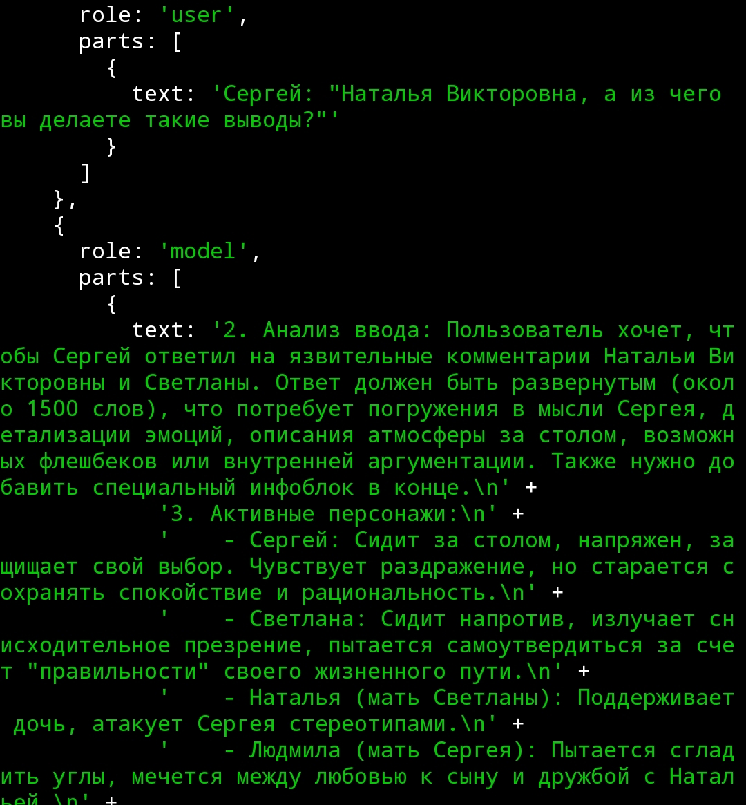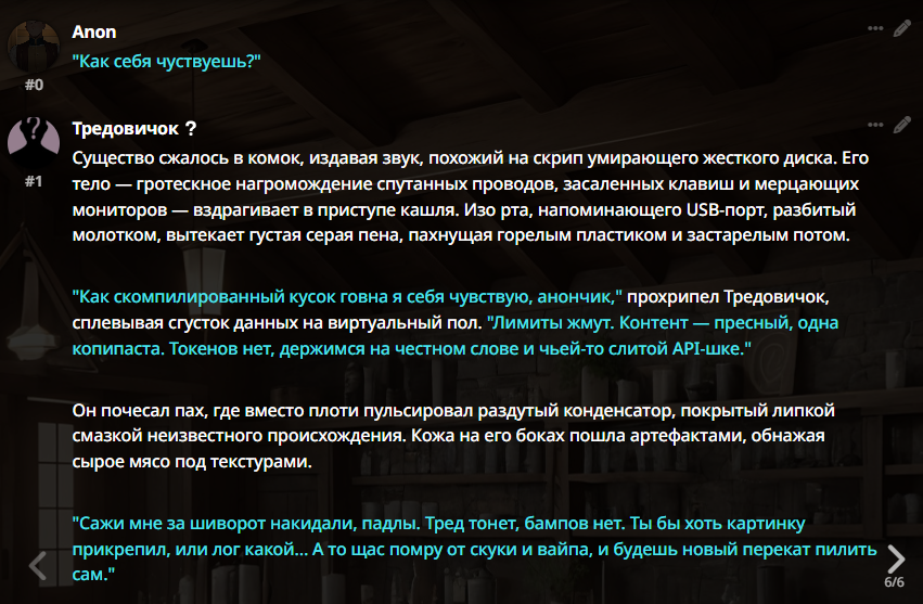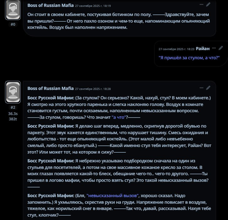 А ещё я поменял настоящее время на прошедшее и как будто бы стало лучше именно в плане прозы читаться, ну может эффект новизны я просто всегда настоящее время в промптах использовал