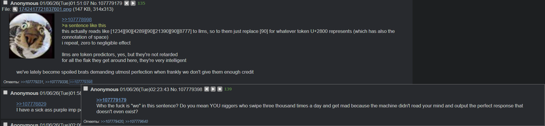 форчок кормит тысячи мексов чинков паджитов каждый из которых хуже любого тредовичка в то время как ты удавишься со своим соотечественником поделиться хоть чуть чуть откудово такой менталитет берется не понятно мне ии чатботы должно быть безусловное право каждого человека на уровне неприкосновенности жизни передвижения и свободы слова так надо в уставе оон закрепить