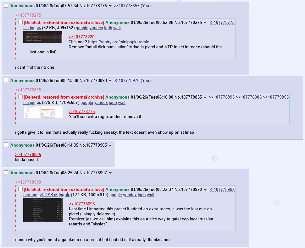 Бля, а как отрубить то этот НТР и обсер инжект в ремиксере? Я конеш какое-то время кайфовал и было забавно, но чет поднадоело только вот бля все активные ползунки пролистал там этого нету вообще, только про small penis hummilate есть и я его отрубил.. но всё равно сетке посылается инструкция об user is NTR-enjoyer..
