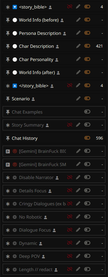 >>1481748 Кроме этой проблемы именно с безжопным расширением всё чётенько (ещё бы придумать как аватарки прикрутить...). Я его использую исключительно для склеивания карточек в одну: всех персонажей кидаю в мут кроме одного, выбираю не скрывать замьютеных чаров и все дескрипшены красиво кидаются в пресет между тегами <characters>, нужные лорбуки сами подтягиваются и сценарии ручками добавить. В остальном не функционал, а рудиментарная залупа, но имеем, что имеем.
