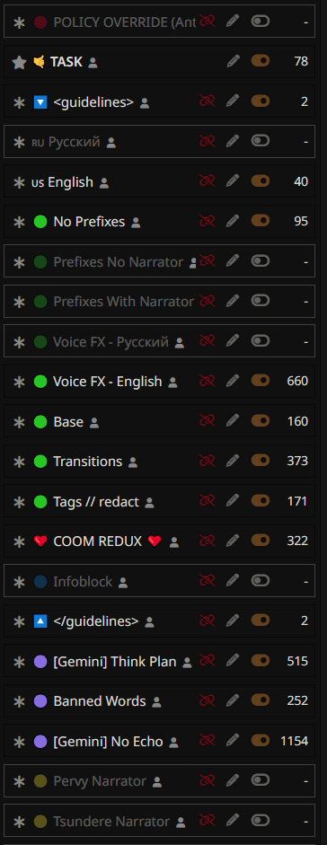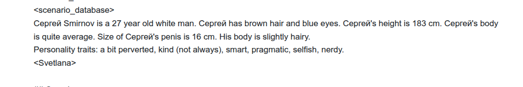 Даже самая слопная карта перестает быть слопной засчёт датасета сетки, в чём я не прав? То есть, если карта слопная, в ней чего то не хватает или что то указано неверно (если чар из какого нибудь фандома например) , то сетка просто подтянет из датасетов. >>1482463 в регексах "убирание слопа" офай, в тегах вытри "natural needs" а в scenario database в рычагах вырежи нтр еще один.