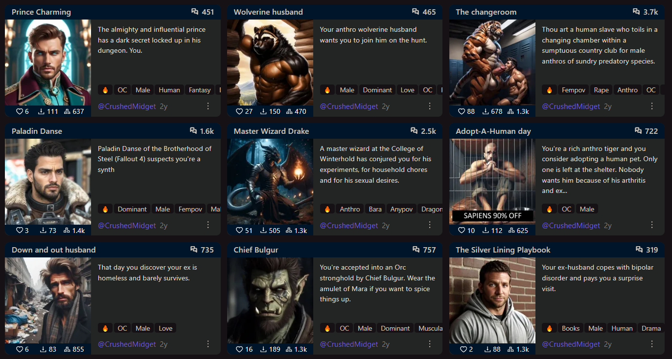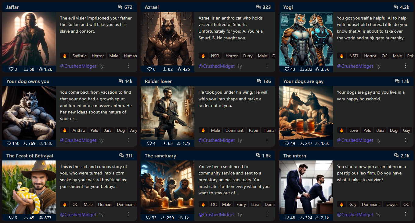 >>1481133 на аисг хаб модерация и охват поменьше, сравнение с чубом лучше. на жаниторе одни жирушные мафиабоссы которые ничем не отличаются друг от друга на чубе дохуя интересных и разнообразных карточек