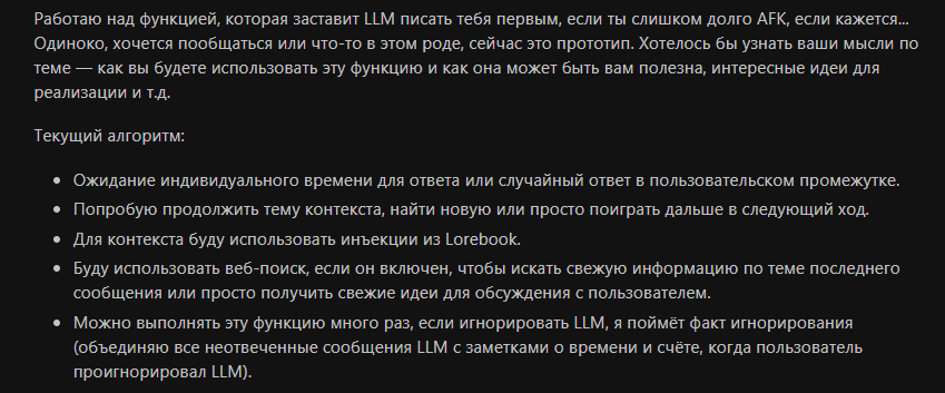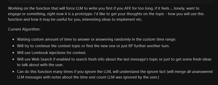 >>1482390 А, я помню. Ну это фиксированная хуйня, да и большая часть механик и так реализуемы или были реализованы. Костылями конечно. Я про это и говорю, главная беда таверны невозможность асинхронных вызовов.
