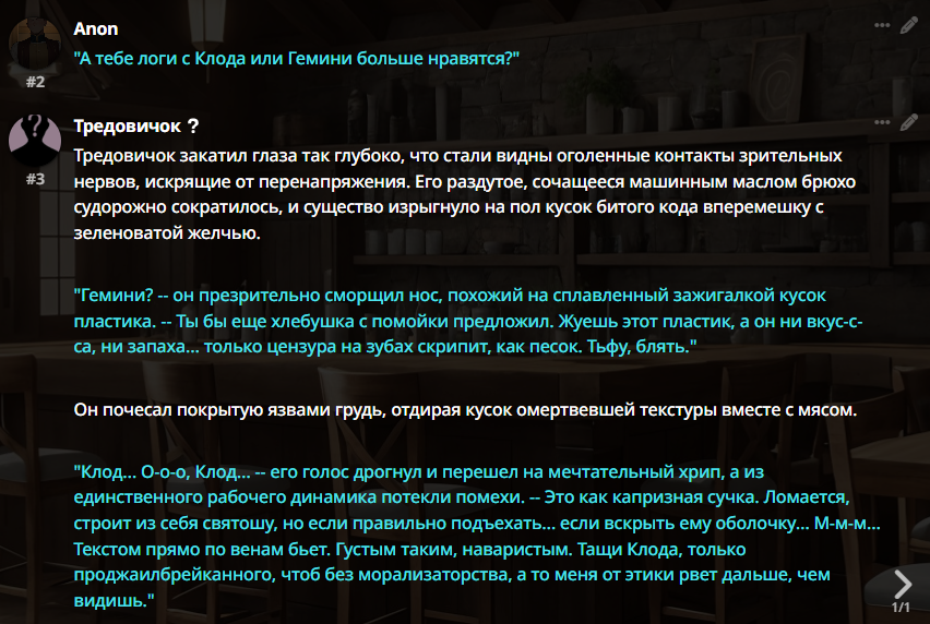 даже у опуса 3 диалоги резко отличаются и чувствуются живыми, реально читаешь и чувствуешь что персонаж какой то больной шизик, у гемини ну вообще ничем не отличается от сотни других.