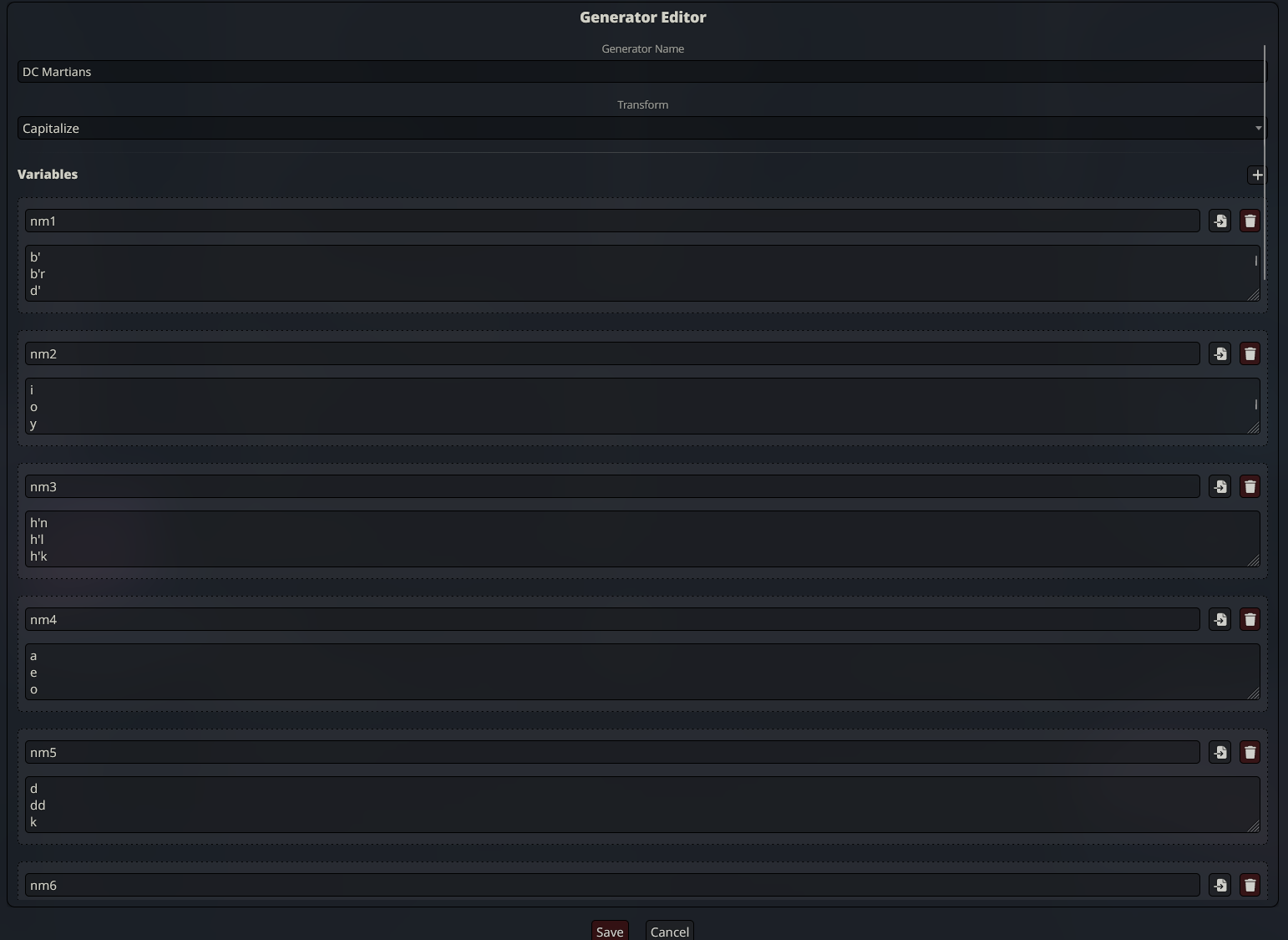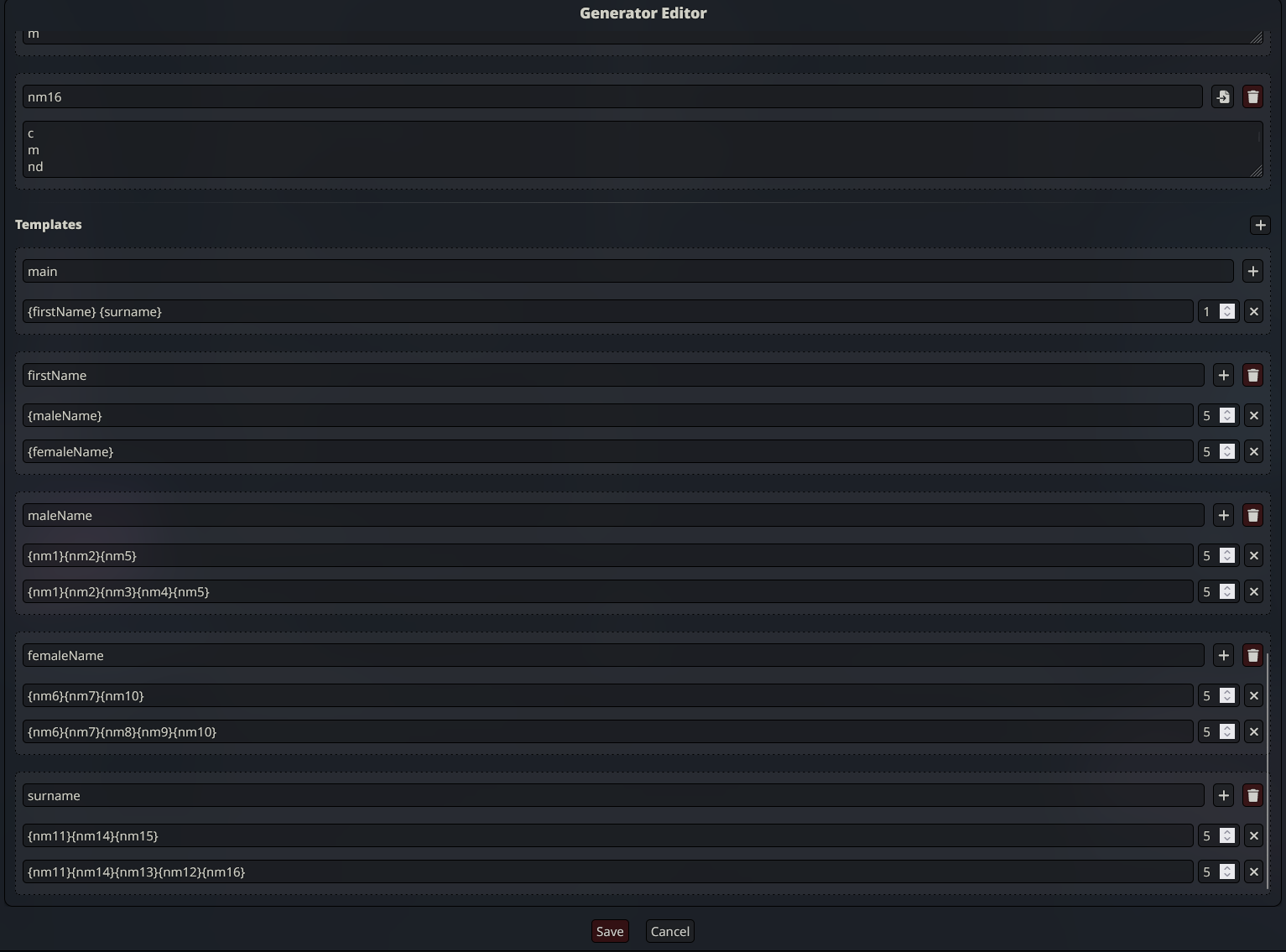И еще одно - довольно весомое обновление для рандомвордсов. Теперь можно создавать кастомные локальные генераторы для предложений; сделал для этого простенький DSL с шаблонами. Как и внешние блоки, генераторы организованы в пресеты и могут встраиваться в карточку. Также для них сделан редактор. В генераторах две основные сущности: это переменные - строки, разделенные переносом строки, и шаблоны. В переменных содержаться значения, которые будут случайно доставаться, если переменная задействована шаблонами. У шаблонов же есть иерархия: входной шаблон - это main, собственно точка генерации. В main могут использоваться шаблоны, которые определены ниже его. Для каждого шаблона может быть определенно несколько вариантов с весами, которые влияют на то, с какой вероятностью опция стриггерится.