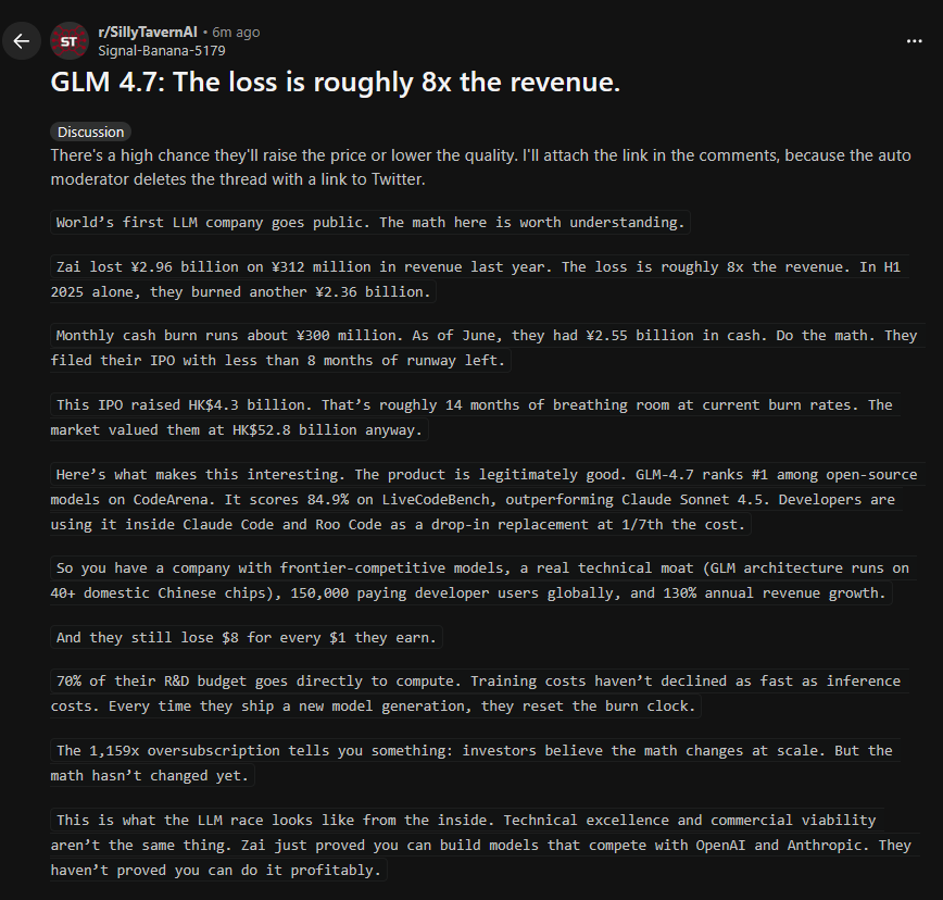 У глм ведь даже проблема не в безмозге как таковом, смозг там иногда наблюдается, а в том что глм с длинным контекстом работает на уровне клода 2. В присутствии гемини, да даже и нынешнего дипсика, глм в этом плане очень слабовато выглядит, в лучшем случае как сетка прошлого поколения.