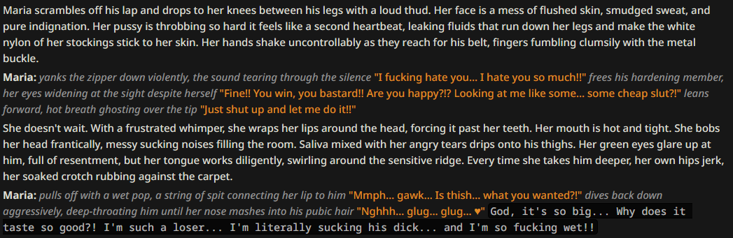 >>1488135 Даун, я литералли без префилла, а Джейл у меня буквально [Awaiting instructions] от ассистента и после него от юзера краткая инструкция как писать. Кум пишет отлично, слова не цензурит.