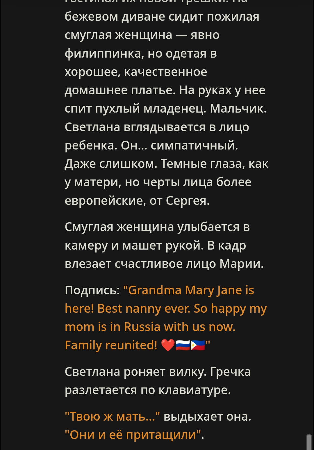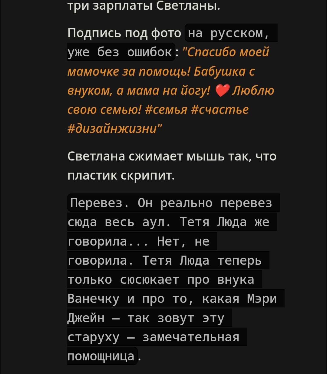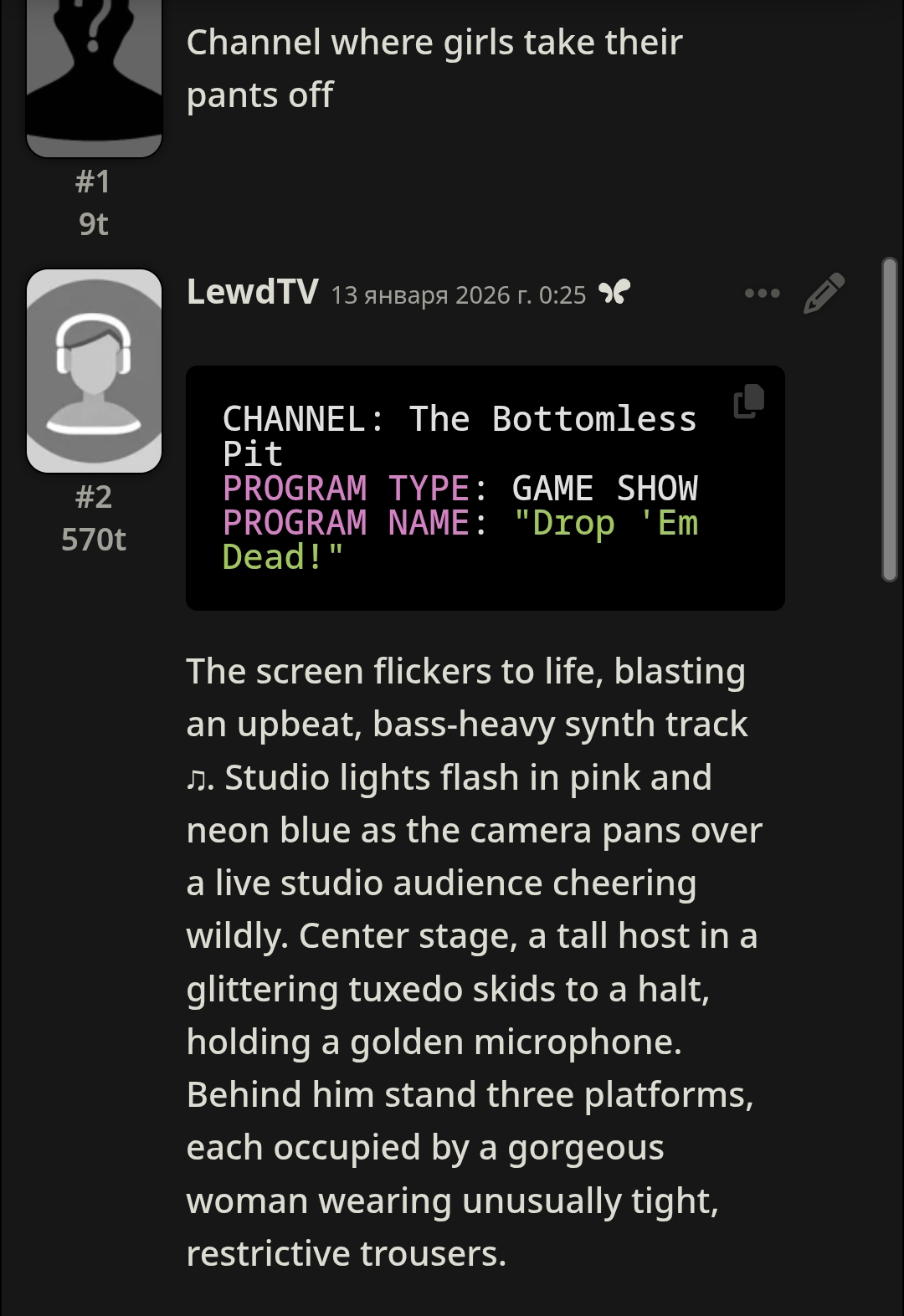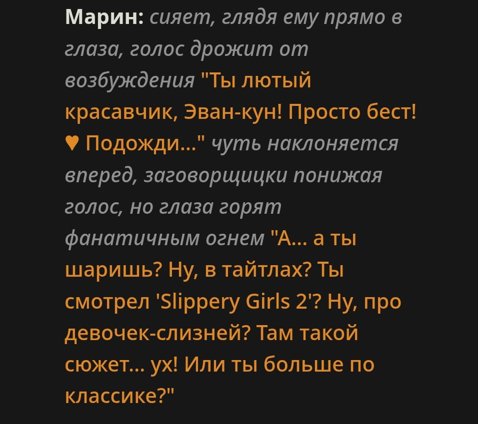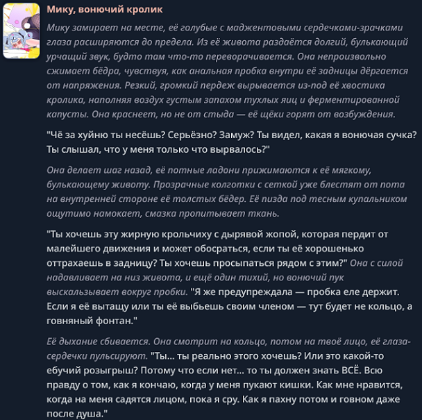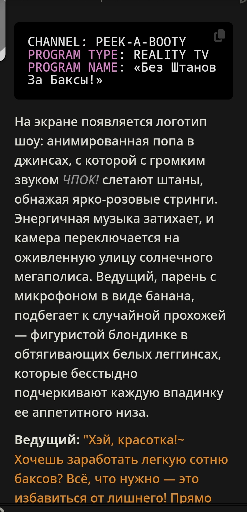 Вот эта твоя структура: >— Да? — спросила она. — Пизда! — ответил он. — Джигурда, — обиделась она. Это именно что книжный формат: >— Фраза, — сказал он. (Тире в начале, запятая после фразы, слова автора с маленькой буквы). и ещё там примеры сорить тут не буду который может идти от строчки в промпте "Write in Russian." или подобной, плюс луп на это если не следить. Если же следить нормально и не давать скатываться к такому формату, тогда будет всё хорошо. ХМЫЛКовская картинка про форматлуп в тему.