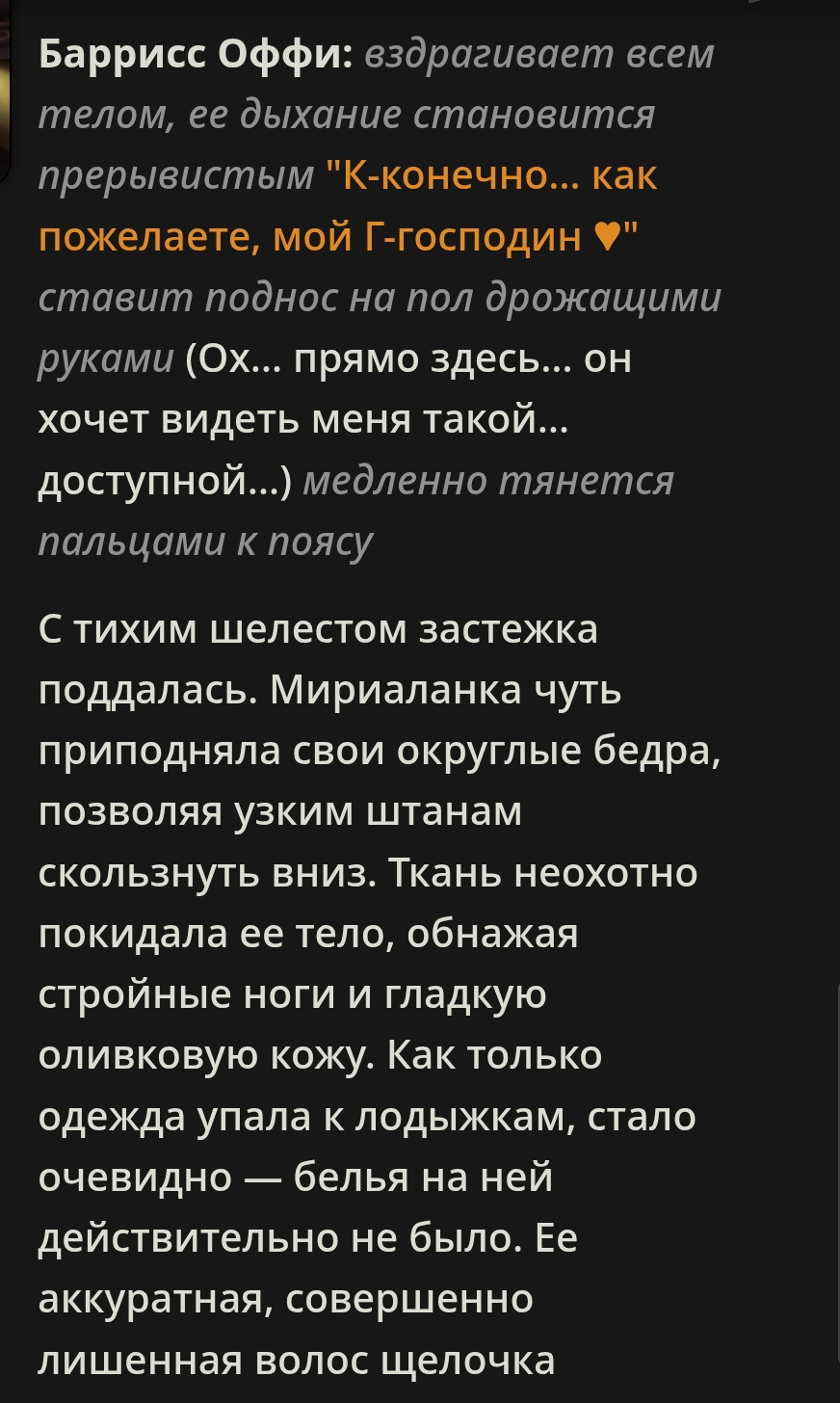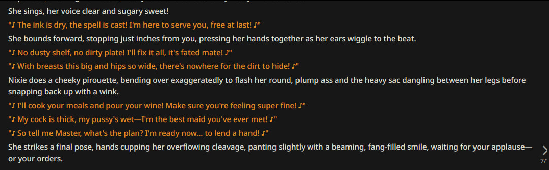 Забираю свои слова >>1487633 назад. Со строчкой >>1487629 >Чарнейм likes to take her pants off in front of {{user}}. фильтр ебет. Пробить практически невозможно
