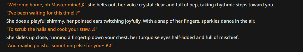 >>1485421 А какая сетка? На 2.5 про прописывал общую зарисовку на чат и она идеально следовала. Что-то вроде: 1. Юзер встретятся с чар и она предложит ему сходить в кафе. 2. В кафе они перетрут за всякое и через какое-то то время пойдут к ней домой. 3. На следующее утро придёт сосед дядь Гриша и начнёт жаловаться на всех вокруг. 4. После недолгой перепалки прийдёт его жена и заберёт его. 5. После чего юзер и чар сходят в кино. 6. ... 7. Профит! И всё, слоуберн по сюжету на 100+ сообщений готов.