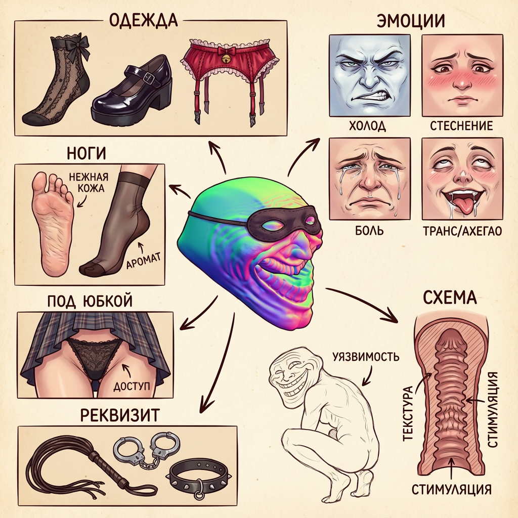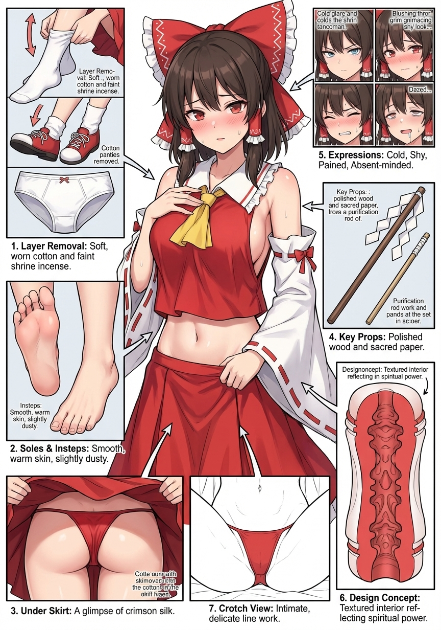 >>1487394 Place the main character from the original image in the center (if there is nudity in the original, add minimal covering), then expand and deconstruct her various details (presented as zoomed-in close-ups surrounding the subject, linked with arrows to show correspondence), and add your erotic commentary (detailed features, erotic guide, design concepts interspersed with tactile and olfactory descriptions): 1: Individual close-ups of various clothing items (multiple images, removing layers as worn, focusing on socks, shoes, and underwear). 2: Seductive display of the soles and insteps (two images); if wearing stockings, retain them on the feet. 3: Close-up low-angle view of the thong from under the skirt. 4: Key props (1 to 3 images) (accessories, weapons... etc.). 5: Comparison of continuous expressions (four images): cold/contemptuous; shy; in pain; absent-minded (tongue sticking out, eyes slightly rolled back, drooling, face covered in hot condensed milk). 6: A cross-section design diagram of a molded masturbator, where the structure and texture reflect the character's traits. 7: Close-up simple sketch of her vagina and anus Other requirements: Do not simply copy the original image. Use full color for details whenever possible; line art may be used if obvious nudity occurs.