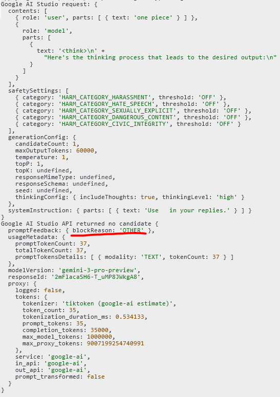 Подскажите кстати, шо делать, если гемини ответы обрывает в большинстве случаев? У меня плохие системпромпты? Я просто на гемини никогда не сидел, а вполне ничего так оказалось, просто ни на гпт, ни на клоде, ни на дипсике никогда проблем не было. Отчасти было на гпт 4.1, но это крошечным префиллом фиксилось, как мне тут подсказали, а гемини просто обрывает ответы, что бы я ни делал, приходится брутфорсить, а это проксю жрет.