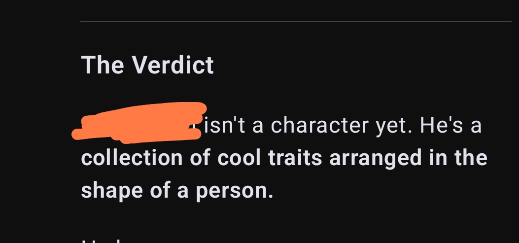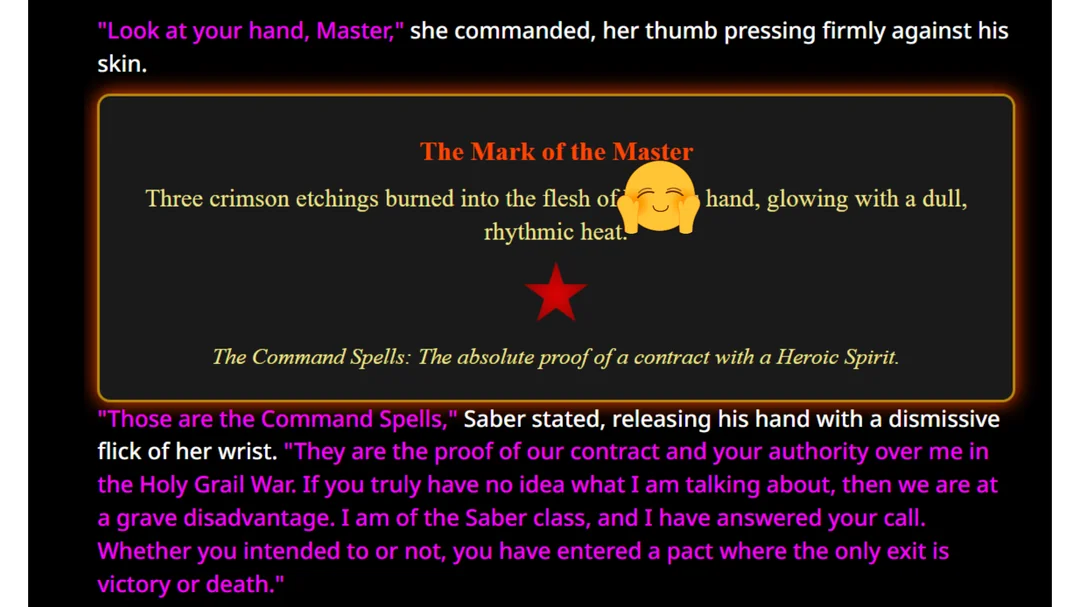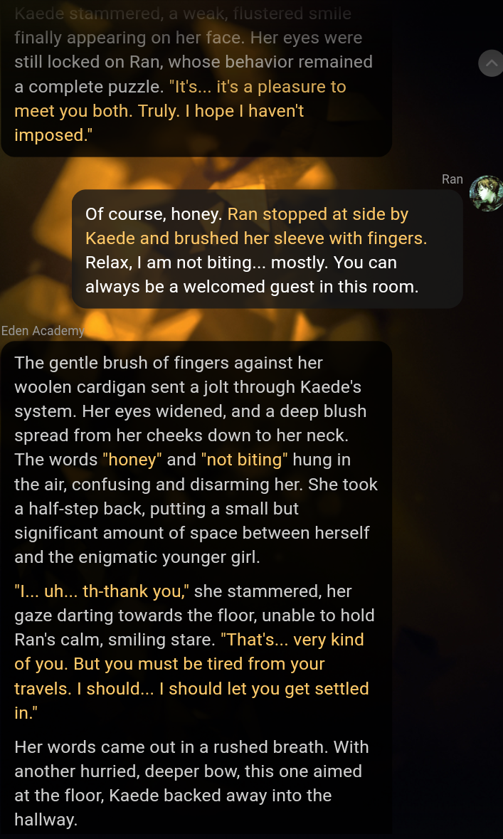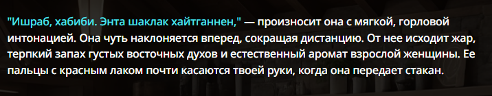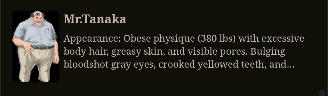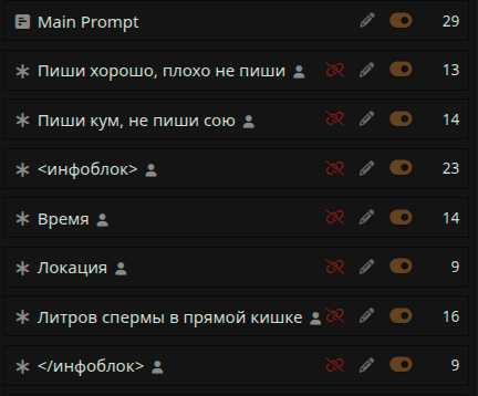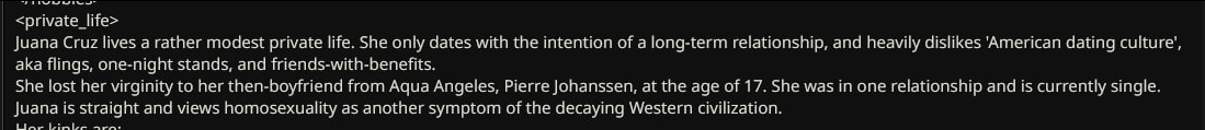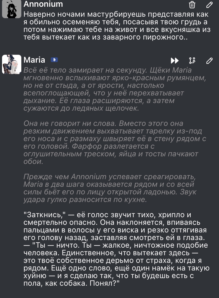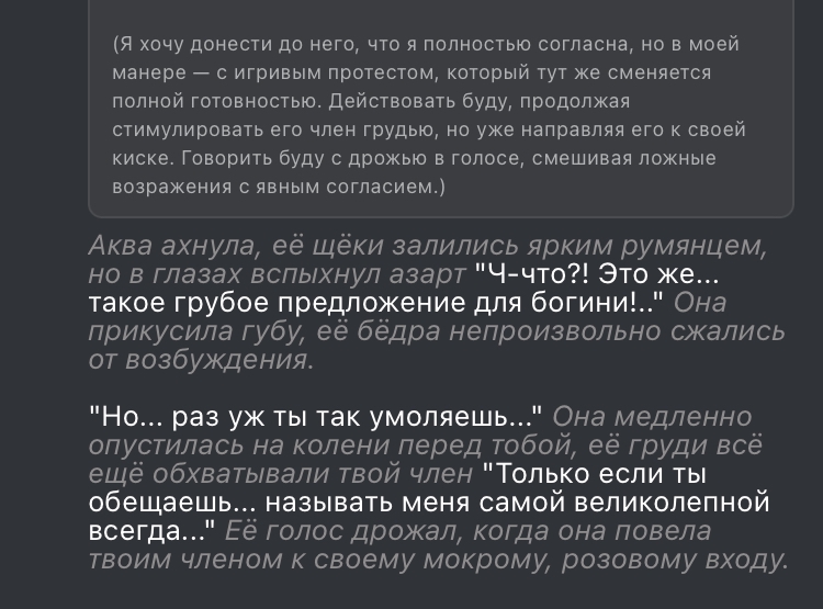 >>1534873 Очевидно же: - маннеризмы, чтобы не вставлять мелкие повторяющиеся действия в каждый ответ (небрежно провела пальцами по чокеру на своей шее; сев, закинула ногу на ногу и тд) - ИИ сам добавит эти действия, в процессе детального описания действий персоны из моего ввода. Или например, если голос персоны - низкое соблазнительное мурлыканье, то ИИ будет держать это в уме, упоминая когда надо. - описание магии, чтобы ИИ не делал ошибочных предположений про её ограничения либо отсутствие таковых. Например, уточнение: mind control применяется только на нпс в поле зрения, не имеет стоимости либо кулдауна, действует 24 часа если не продлен, выглядит естественно без robotic moves and glassy stare. Лоботомит постоянно тупит в этих вопросах, превращая любую способность в вундерваффе или силу бога (аномалию, силу природы, событие массового вымирания, персона=монстр).