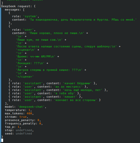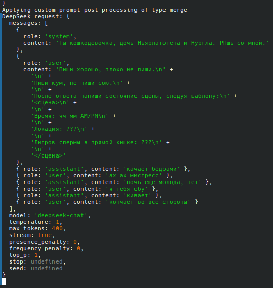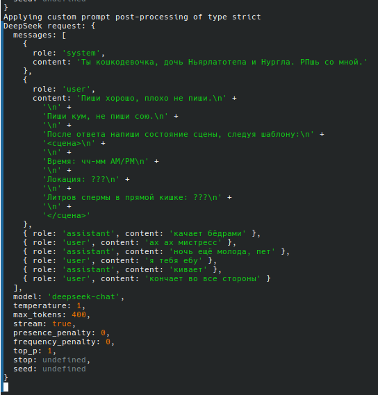 >>1537092 спасибо, версию бы сухого безжопа, но там видимо из-за роли от какой посылается чатхистори, глм не особо работает как надо, плюс, не работает стопстринг, а если ставить "клиент" версию стопстринга, то глм все равно генерит простынь текста и за юзера, и это долго, хоть и вырезается таверной.