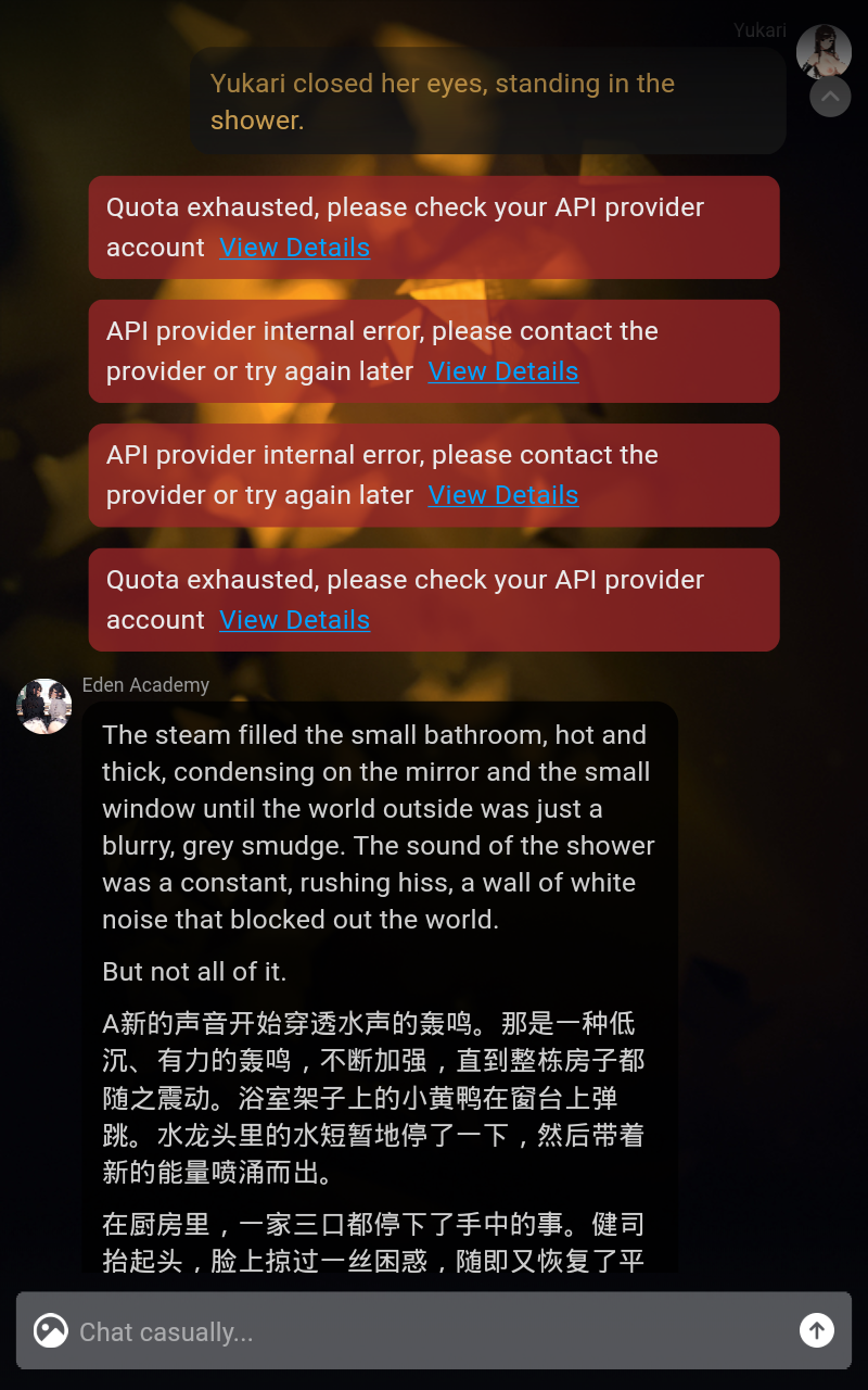 Глм 4.6 на iflow (free tier) какой-то песдец. Сначала уйма ошибок (api quota - это рандомная, не постоянная) и пустые ответы. Затем мандарюсик без каких-либо причин. Причём, раньше вставлял китайский вариант некоего слова, с его англ переводом в скобках, либо вводил японские фразы из-за японского сеттинга. Но такое чтобы весь ответ на другом языке, вижу впервые.