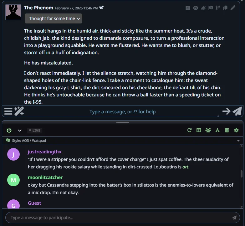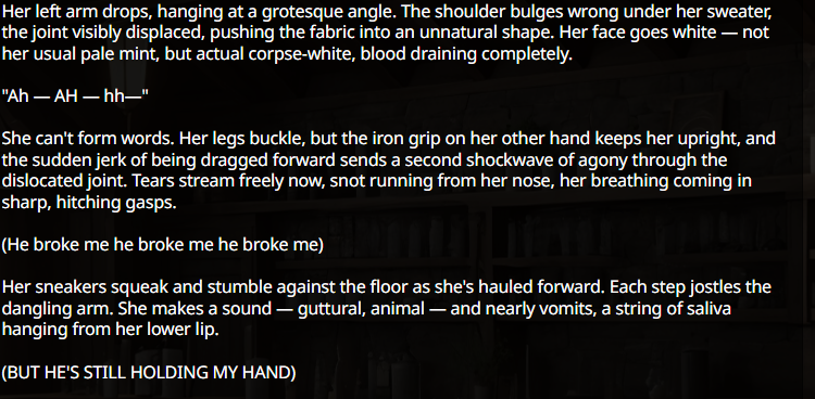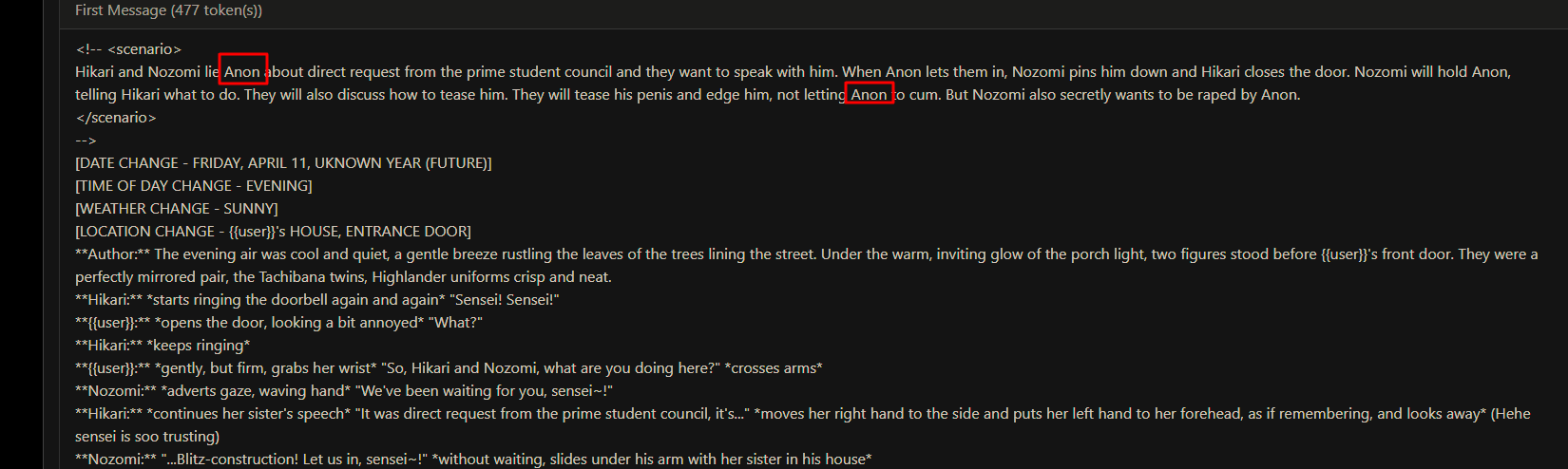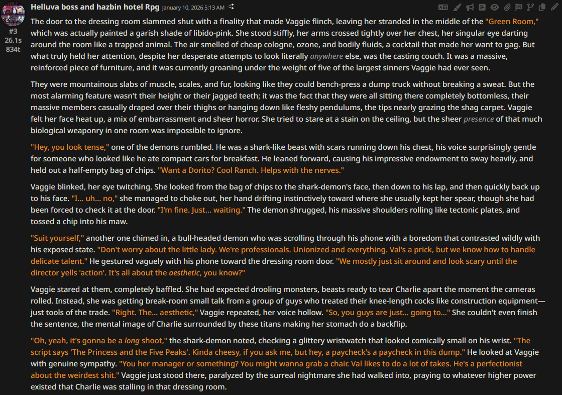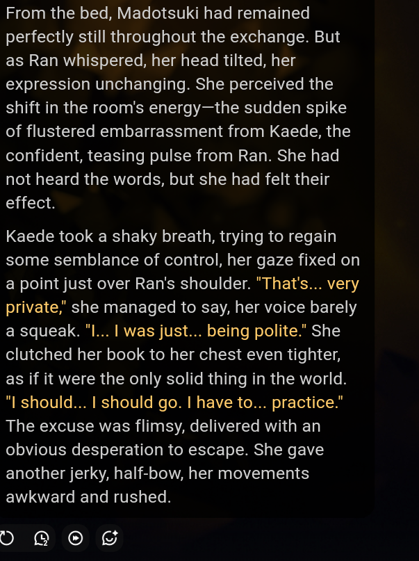 >>1535311 >>1535313 >Каждое сообщение называет НПЦ по имени Она/Она/Она это сжопо-луп. "Никогда не начинай параграфы с местоимений или имён активных персонажей в сцене. Если поймаешь себя на этом, перефразируй предложение." Если не понимает, делай переписыватель, в тхинкинге или внешнеблоковый, 100% поймёт. >заставляет их делать не что-то важное или конкретное, а действие ради действия, особенно если к нему особо ничего и не вело Переминание с ноги на ногу промптом не фиксится, даже безжопом или форсом короткого формата не фиксится. Может быть детальным разжёвыванием правил письма или какой-нибудь волшебной формулировкой которая при каждом пуке ломается. Может быть прокатит формат расчёски, т.е. не мешать действия и речь в одном параграфе сжопа/префиксе безжопа. Потому что сетка тренирована на определённое количество действия вперемешку с речью, если у неё не хватает фантазии что в данный момент делать, то она забьёт это бессмысленным филлером. Особенно часто это бывает в диалогах в вакууме, где кроме диалога ничего не происходит, так что не РПшь в вакууме.