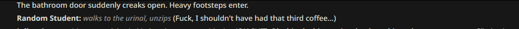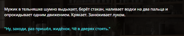 А как вы на безжопе решаете когда писанина за юзера происходит не через экспозицию а через других чаров? например к чару 1 подходит чар2 и говорит типа воот пока тебя не было юзер спрашивал о тебе