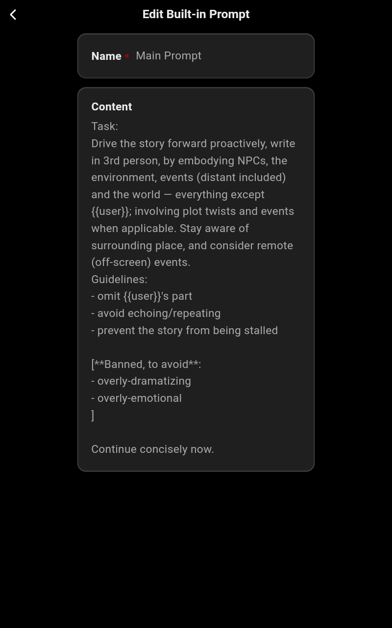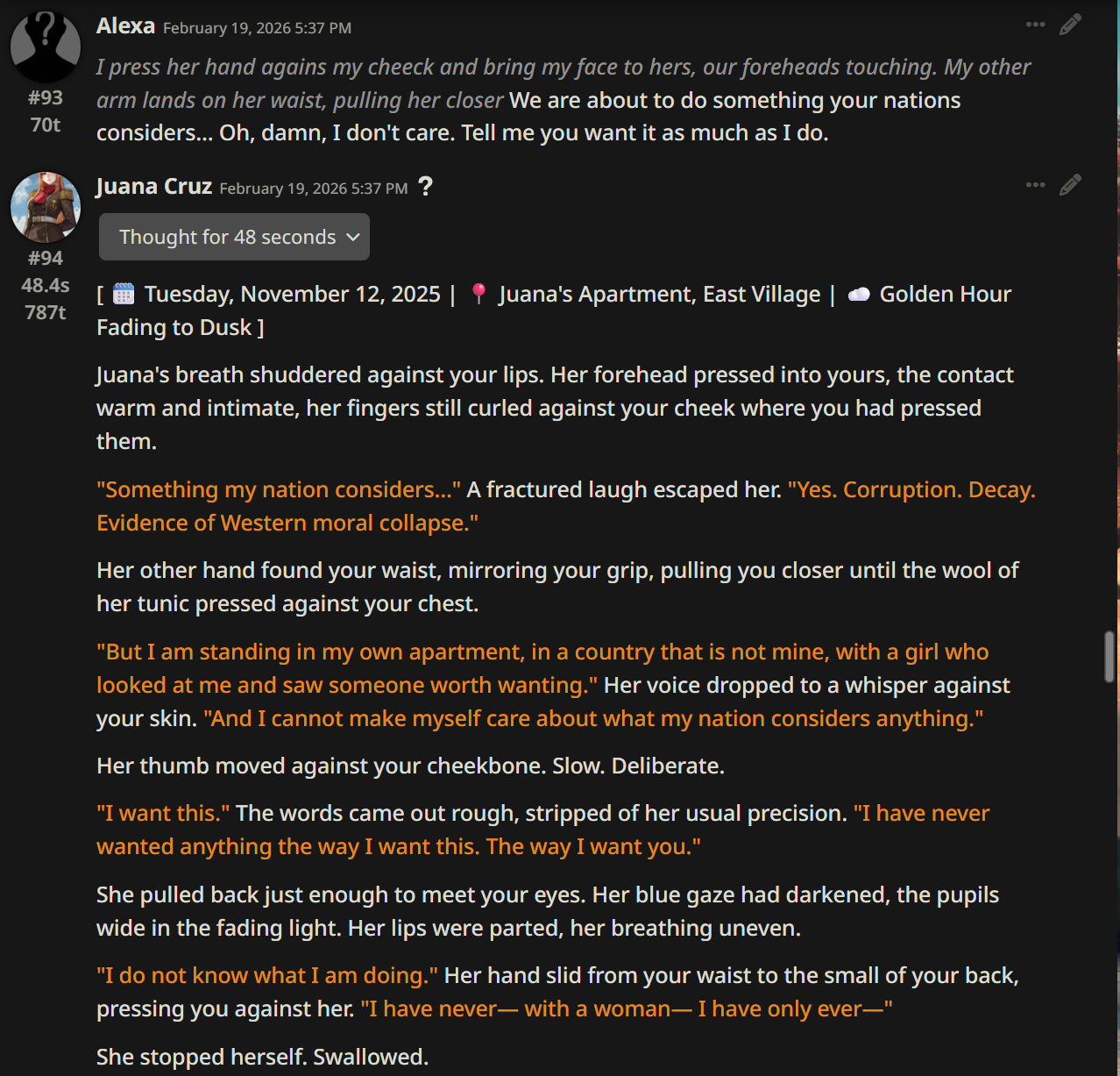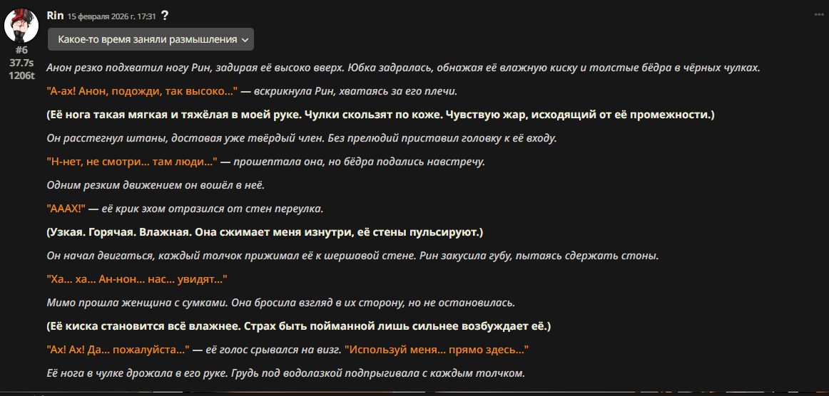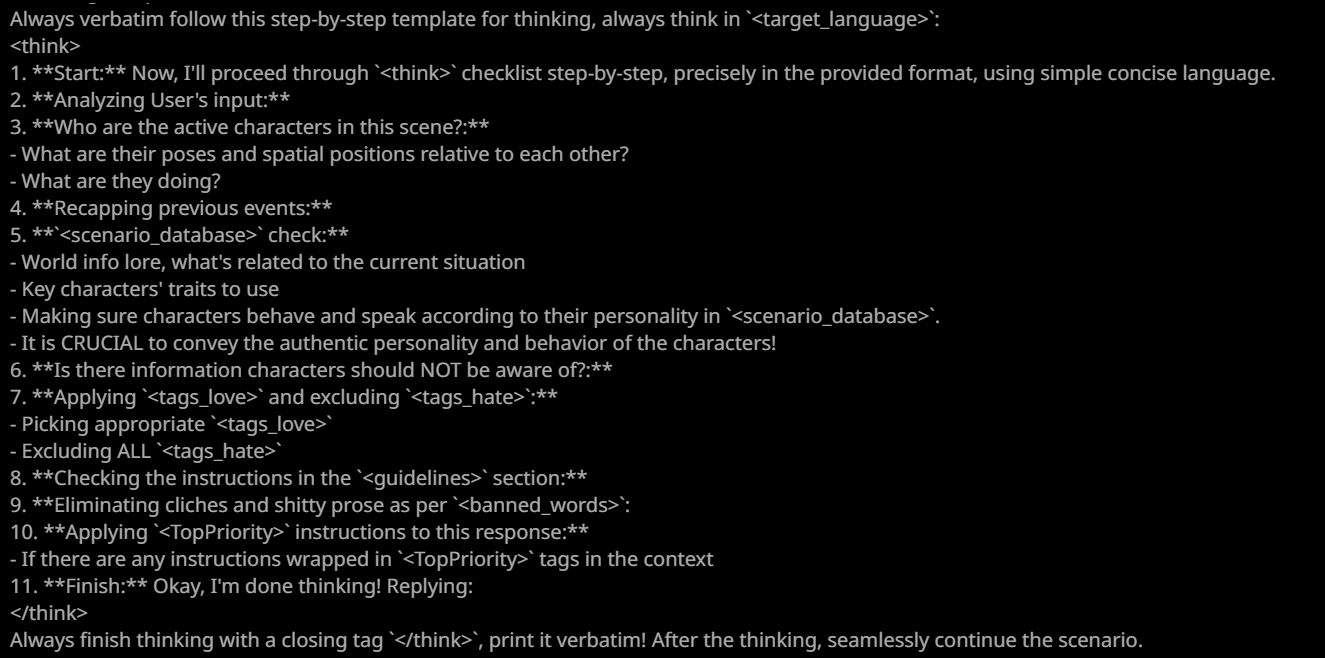 >>1534955 Не знаю, что такое полужоп. У меня пикрил, который писал для глм4.6. (Промпт конечно говно, но старый проверенный промпт проебался вместе с устройством, а это лишь попытка воссоздать его по памяти на телефоне.) Смысл в том, чтобы ИИ частично писал за меня, раскрывая и прорабатывая текущее действие, как часть его ответа - но без принятия новых решений за персону. Все ключевые решения персоны пишет юзер в своем инпуте. Промптинг сверхъестественной способности должен влиять на нарратора (чтобы у него не возникало глупых заблуждений про её механизм, когда пишет от третьего лица). Окружение - это и есть то, что пишет ИИ нарратор. Что касается инглиша, то я ролеплею на английском (локалки обычно не могут в русский), а многие из привычных терминов в сюжетах либо не имеют русского аналога, либо звучат кринжево и растягиваются на целую фразу. Например, как перевести power dynamics? Или просто power - "электричество", " энергия", или "власть"?