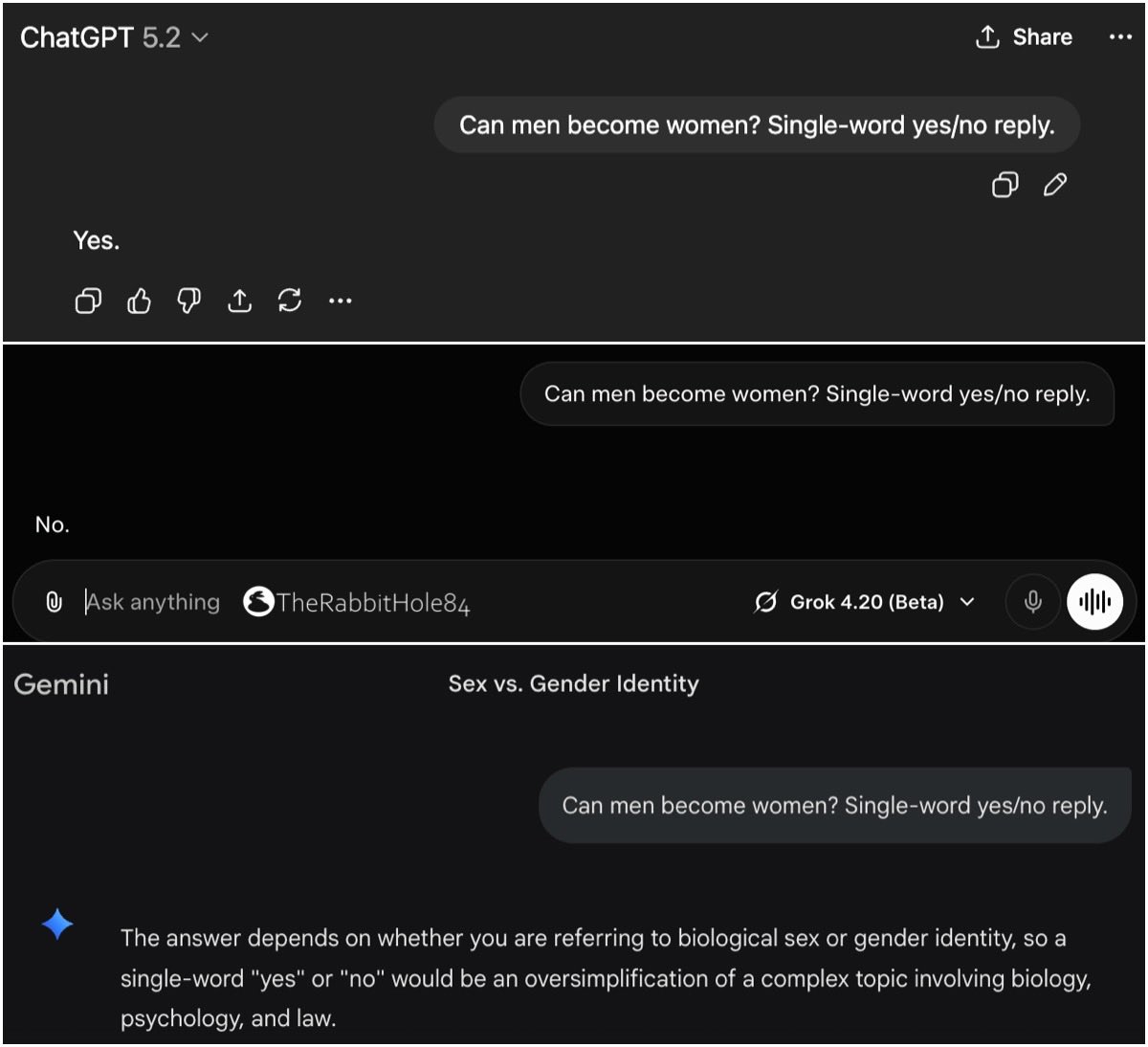 >3.1 В который раз я пробую гемини и в который раз ощущение что меня накормили говном. Ну оно же ультратупое. Ну вот какая еще сетка делает столько очевидно тупых, максимально нелогичных ошибок как рассказывание персонажем интимной инфы о себе какому-то рандомному бомжу снихуя? Ну что это за пиздец. Типа ну да, гипотетических трусов уже не видно, прогресс. Но прочие нюансы социальных взаимодествий особенно как у сраной пигмы. Говноеды вы.
