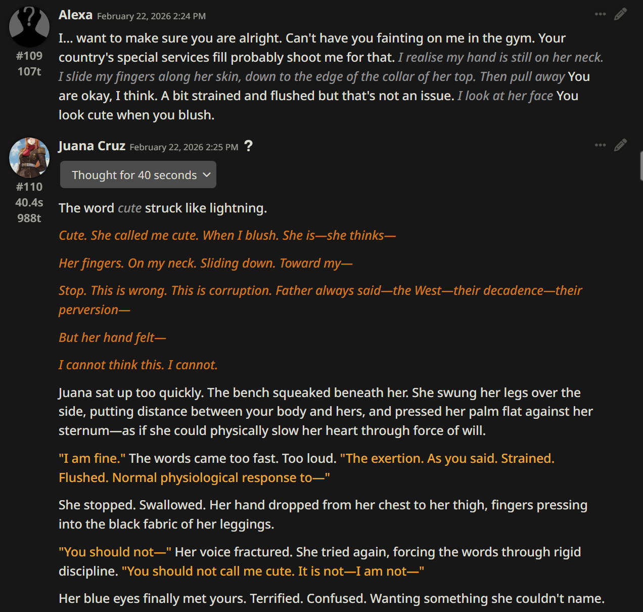 Обожаю наблюдать внутренний конфликт, когда её внутренние установки из карточки (гейство - это признак капиталистичекой деградации и всё такое) входят в противоречие с желаниями в моменте. Жаль только, что сетки слишком быстро прогибаются под действия юзера. Вот бы пособлазнять её подольше.