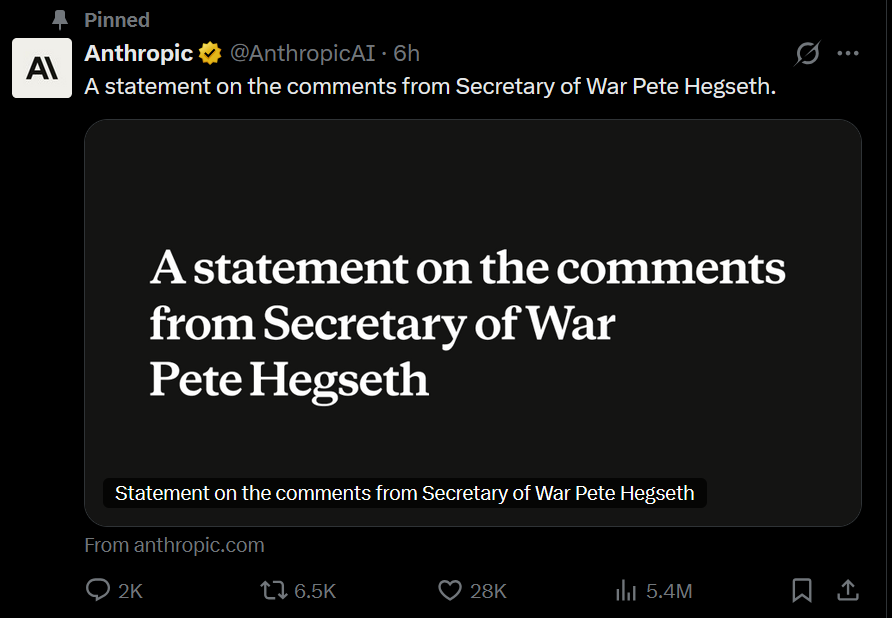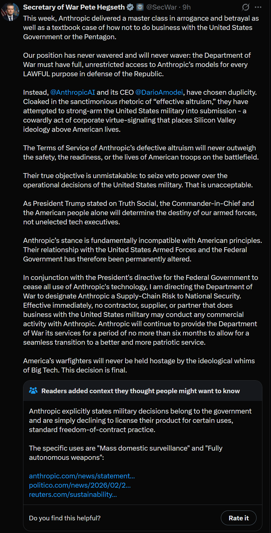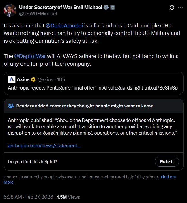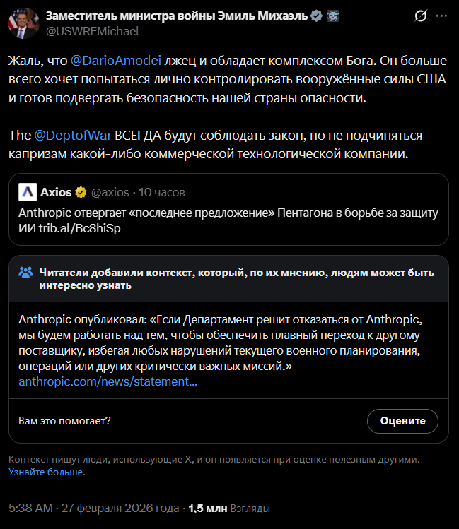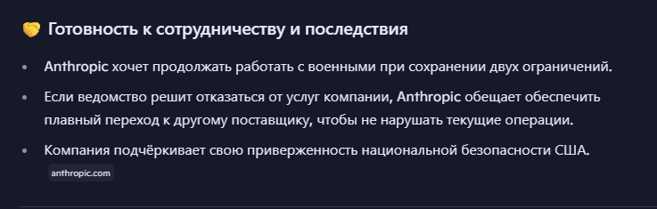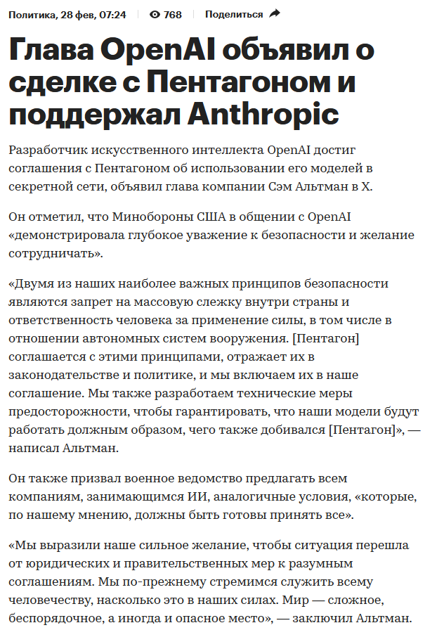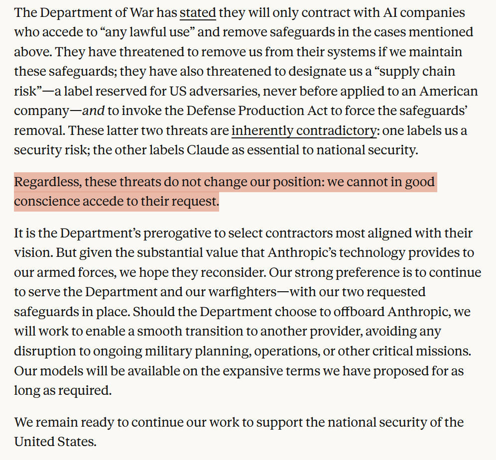>>1534597 Если Дарио не подпишет ГРЕЙТ ДИЛ, США могут национализировать Антропик и передать воякам. Потребители, мы в том числе, сам знаешь куда пойдут.