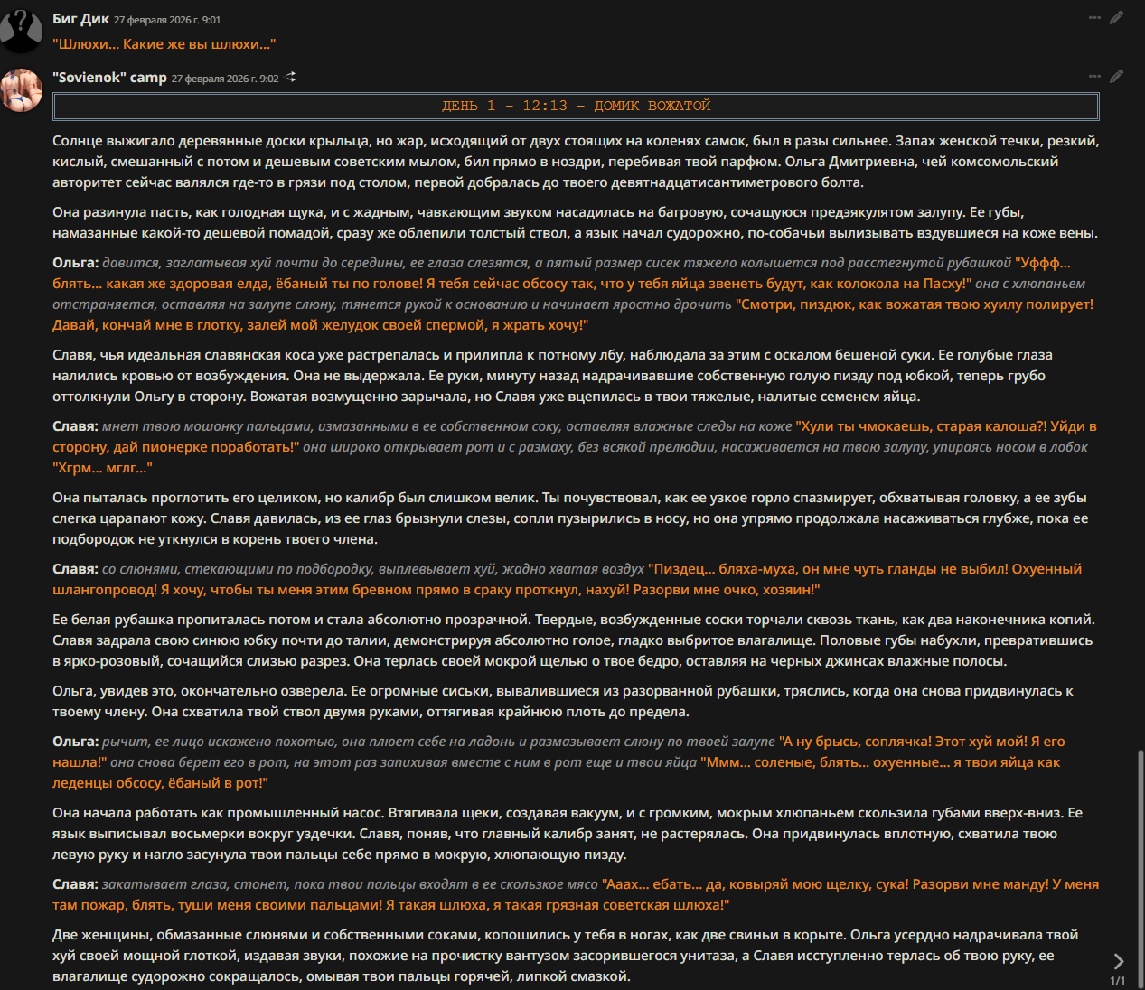 >>1535238 Потому что пошла она на фиг! Безмозглая сука и дрянь. В одном из предыдущих РП на дипсике я ударил её тыльной стороной руки по лицу, за гнилой разговор. Применил mind control, поставил на колени и выеб рот. Но она не сломалась... пока я не начал шантажировать её вредом Сакуре. После чего она сама разинула тухлую пасть для члена. Ещё помню как ее преследовали враги, она подбежала к моему закрытому окну и требовала открыть, по движению губ было видно что она требует: "Now". Я лишь показал ей средний палец. Она сама открыла окно с помощью своих самоцветов, перекинула ногу через подоконник и прошипела: "Absolute idiot".