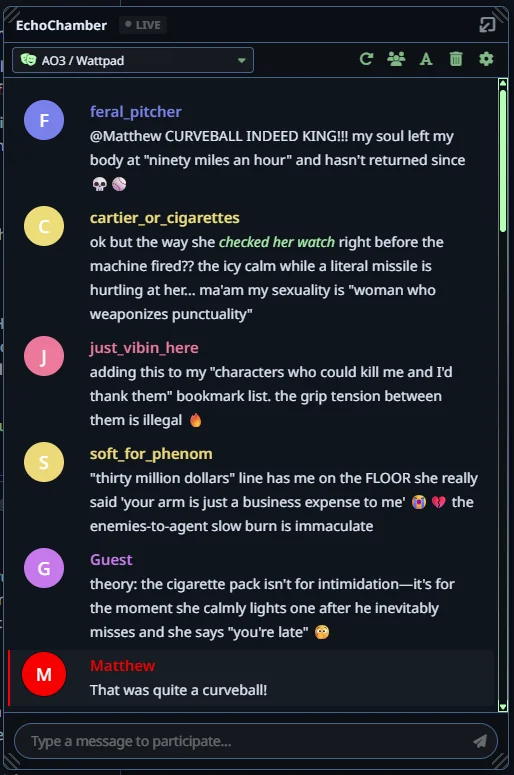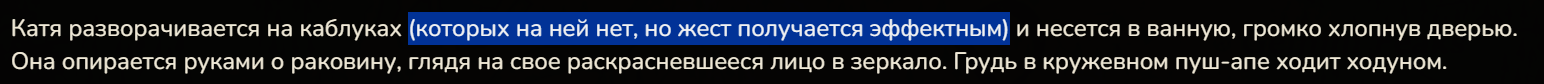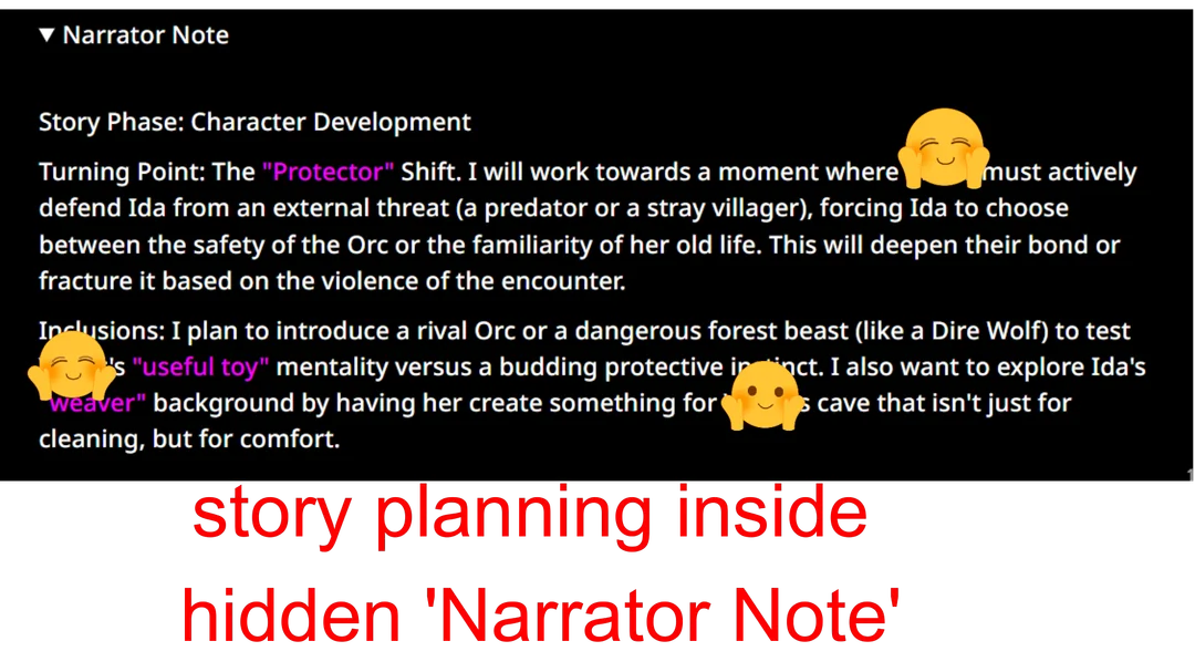 Мне нравится когда нейронка периодически переключает внимание на события где-то вдали, косвенно связанные с персоной. Это помогает вводить рандомные (но логичные) события в последующих ответах, для того чтобы нарратив был достаточно проактивным. (Главное, чтобы это не перешло в форматный луп, а также чтобы ИИ не слишком хуел с читерящими антагонистами.) Была даже мысль сделать скрытые от юзера xml блоки в конце ответов, отсылающие к рандомным местам и событиям (Tavo умеет в regex).