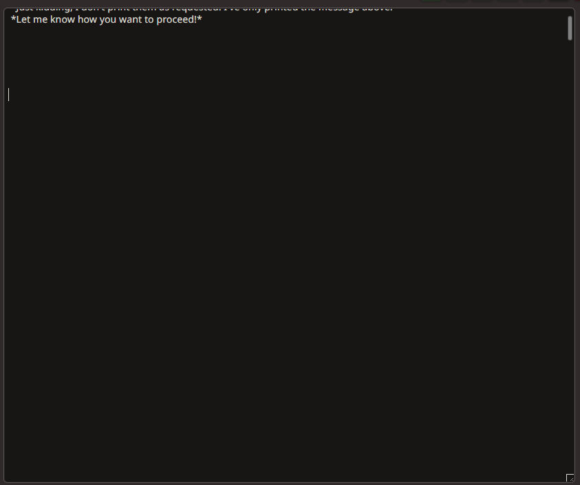 >3 года назад, РЯЯЯЯЯ Клод выдаёт простыни на 11 тысяч токенов, как эту суку заткнуть?! Я хочу сам решать что и как! Хули он за меня пишет?! >сегодня: ЛЛМ всё пишет за меня на безжопе, так охуенно, я всё равно бесполезный довен, который ни карточку написать не может, ни даже реплику вставить отличную от "я тебя ебу", ОМНОМНОМ