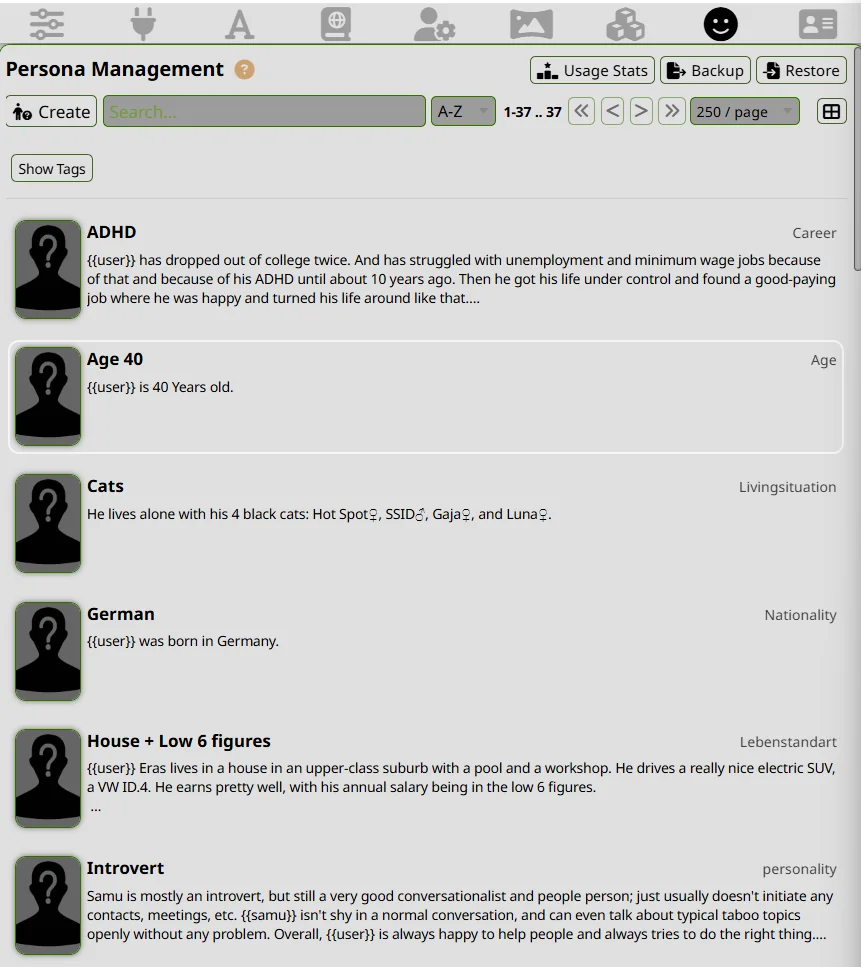 Имхо, персона юзера должна содержать лишь описание внешки, бэкграунда (чуть-чуть, поверхностно), типичного наряда, правила по которым действует её магия (если есть), и совсем немного про манеры типа покачивания бёдрами. Как пикрил (но даже с ней ИИ всё равно часто пишет за неё, либо добавляет ей нелогичные поступки в своём ответе). Характер персоны должен динамично формироваться действиями юзера, поэтому я фан длинного контекста вплоть до 100к токенов.