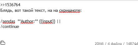 >>1536764 >sendas Author: {{input}} || >/continue Ахх, только сейчас обратил внимание, что в посте с объяснением >>1536726 и было написано с двумя звездочками, просто сосач их интерпретировал как жирный текст в моём браузере, из-за этого немного запутался.